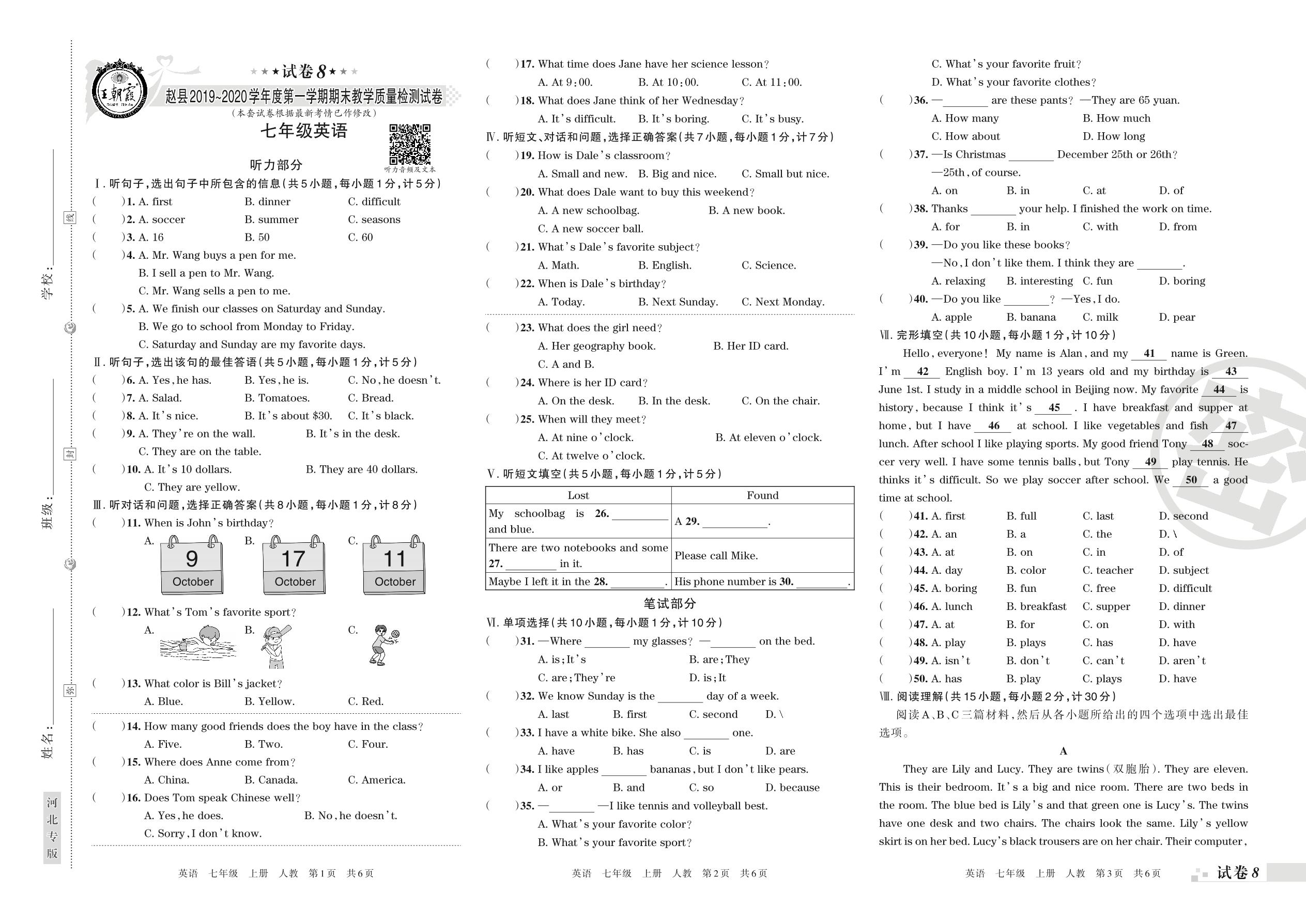 2019-2020学年第一学期石家庄市赵县七年级英语试卷(人教版)【8】