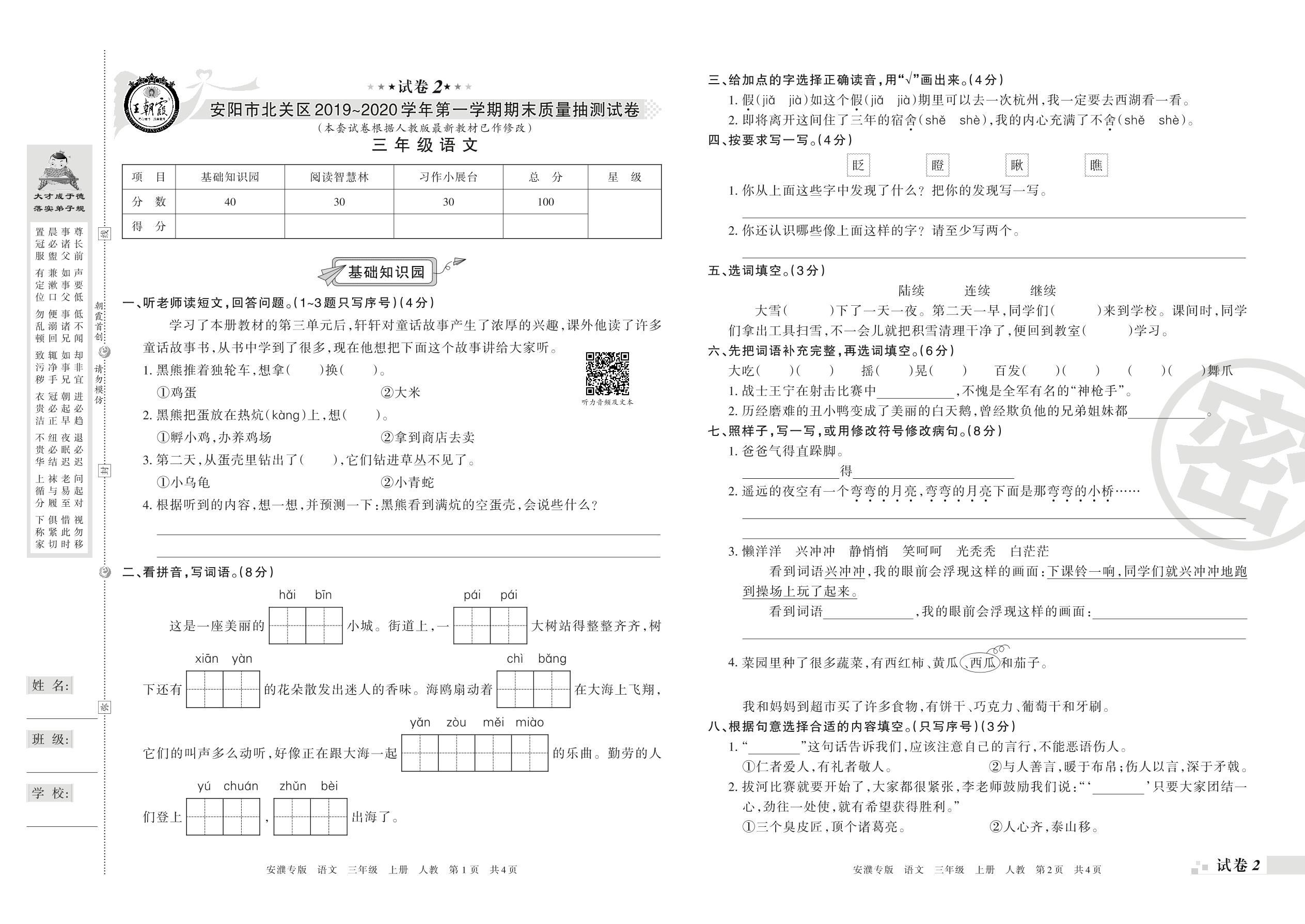 2019-2020学年第一学期安阳市北关区三年级语文试卷(人教版)【2】