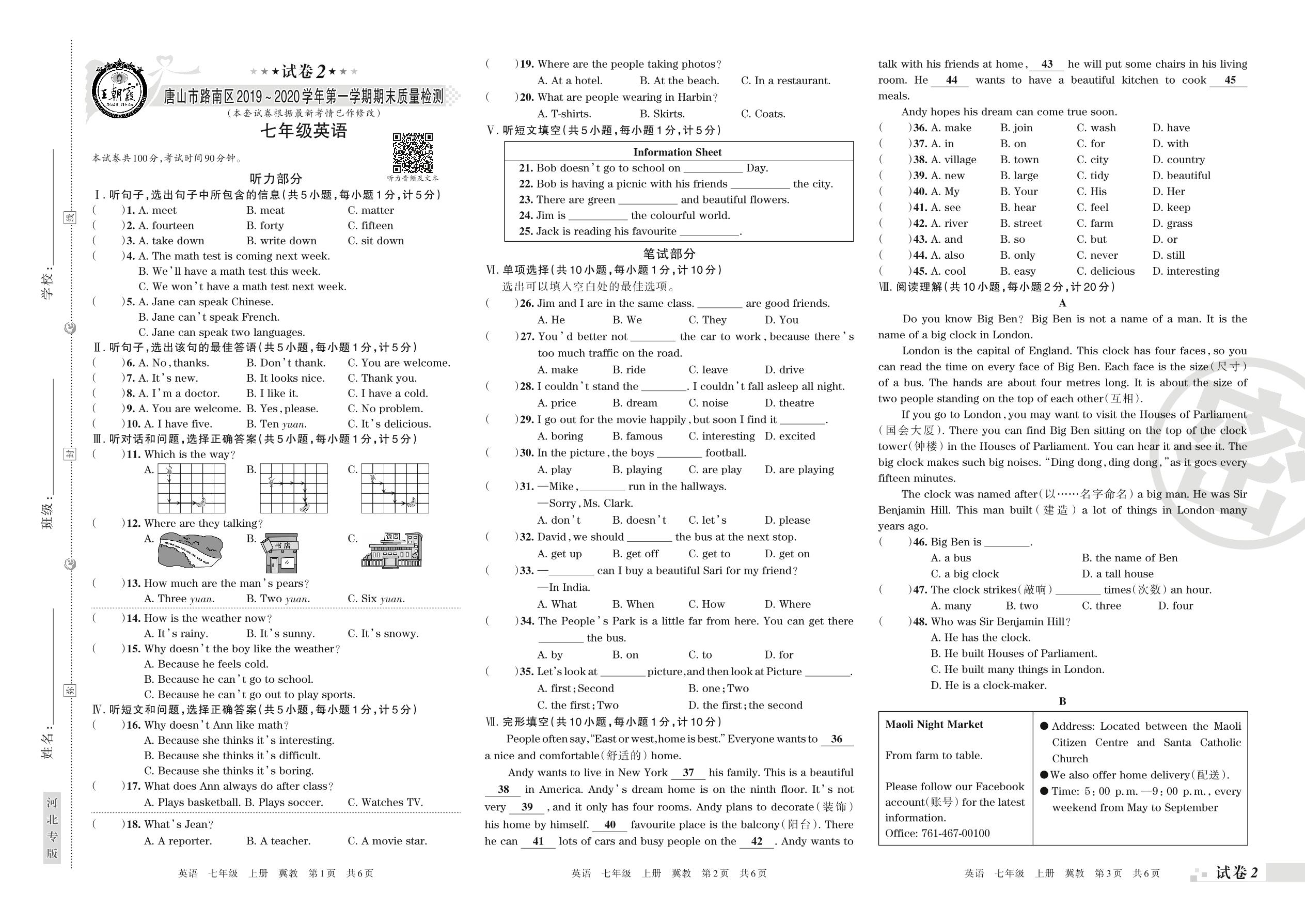 2019-2020学年第一学期唐山市路南区七年级英语试卷(冀教版)【2】