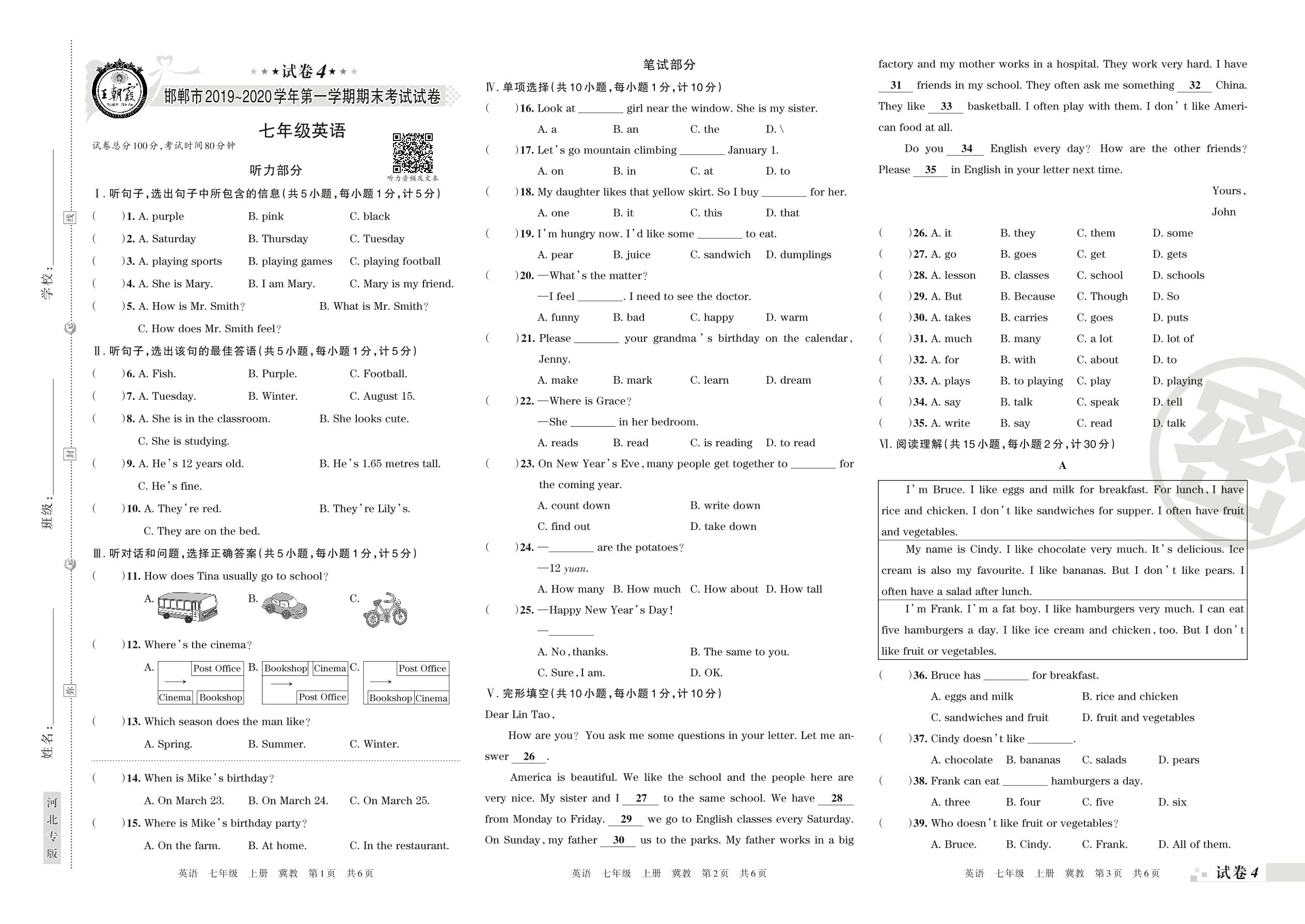 2019-2020学年第一学期邯郸市七年级英语试卷(冀教版)【4】
