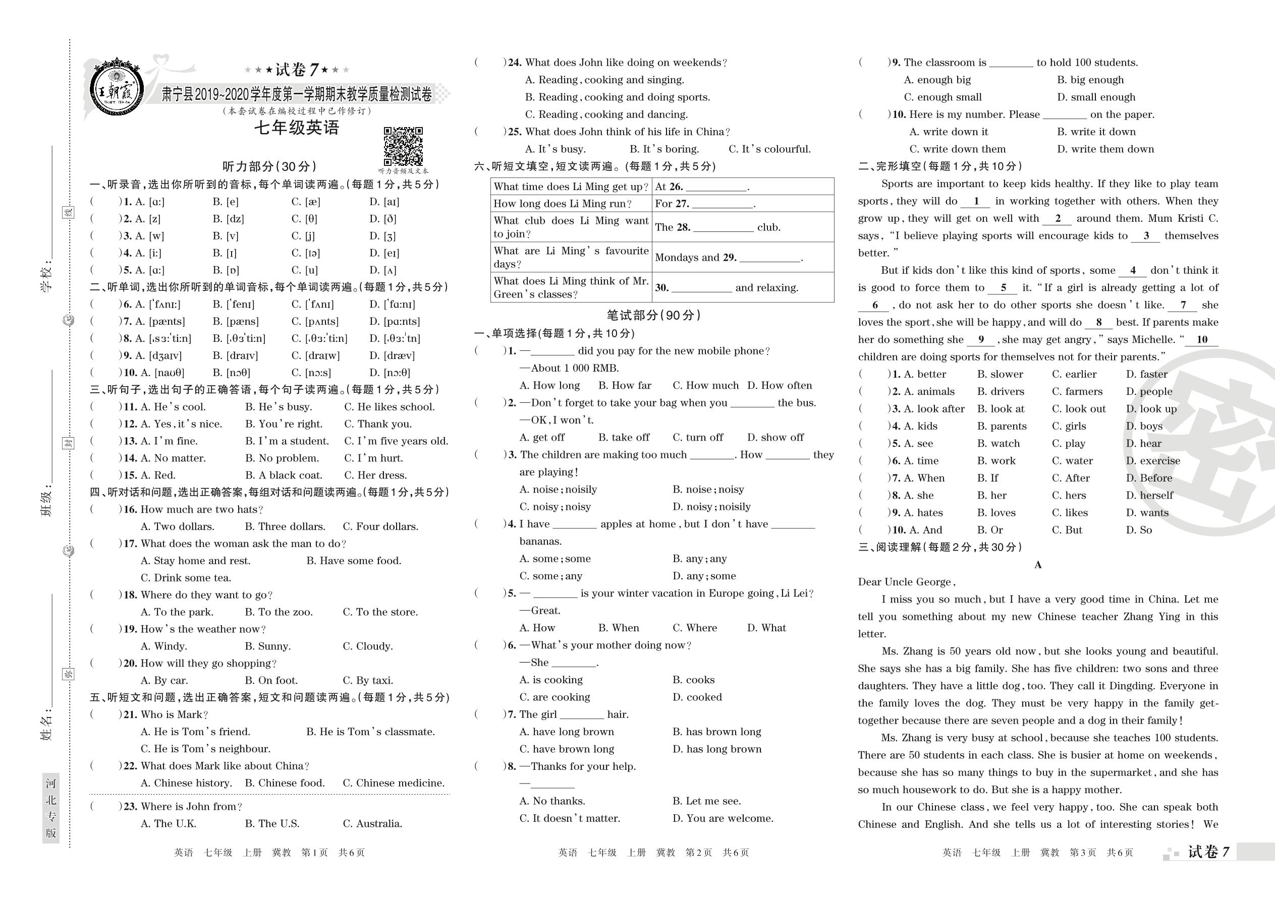 2019-2020学年第一学期沧州市肃宁县七年级英语试卷(冀教版)【7】