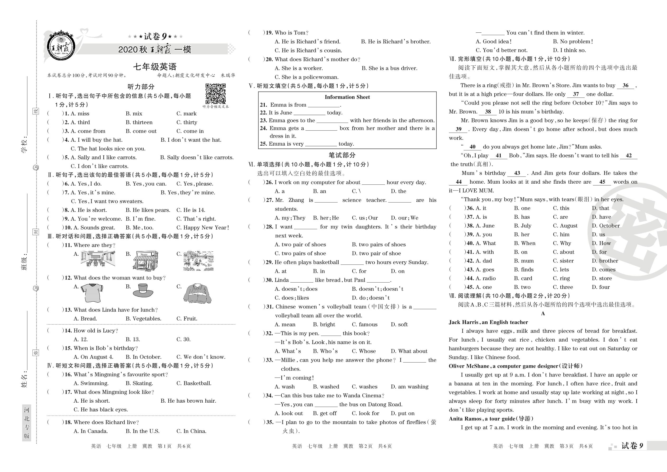 王朝霞期末模拟卷七年级上册英语(冀教版)【9】