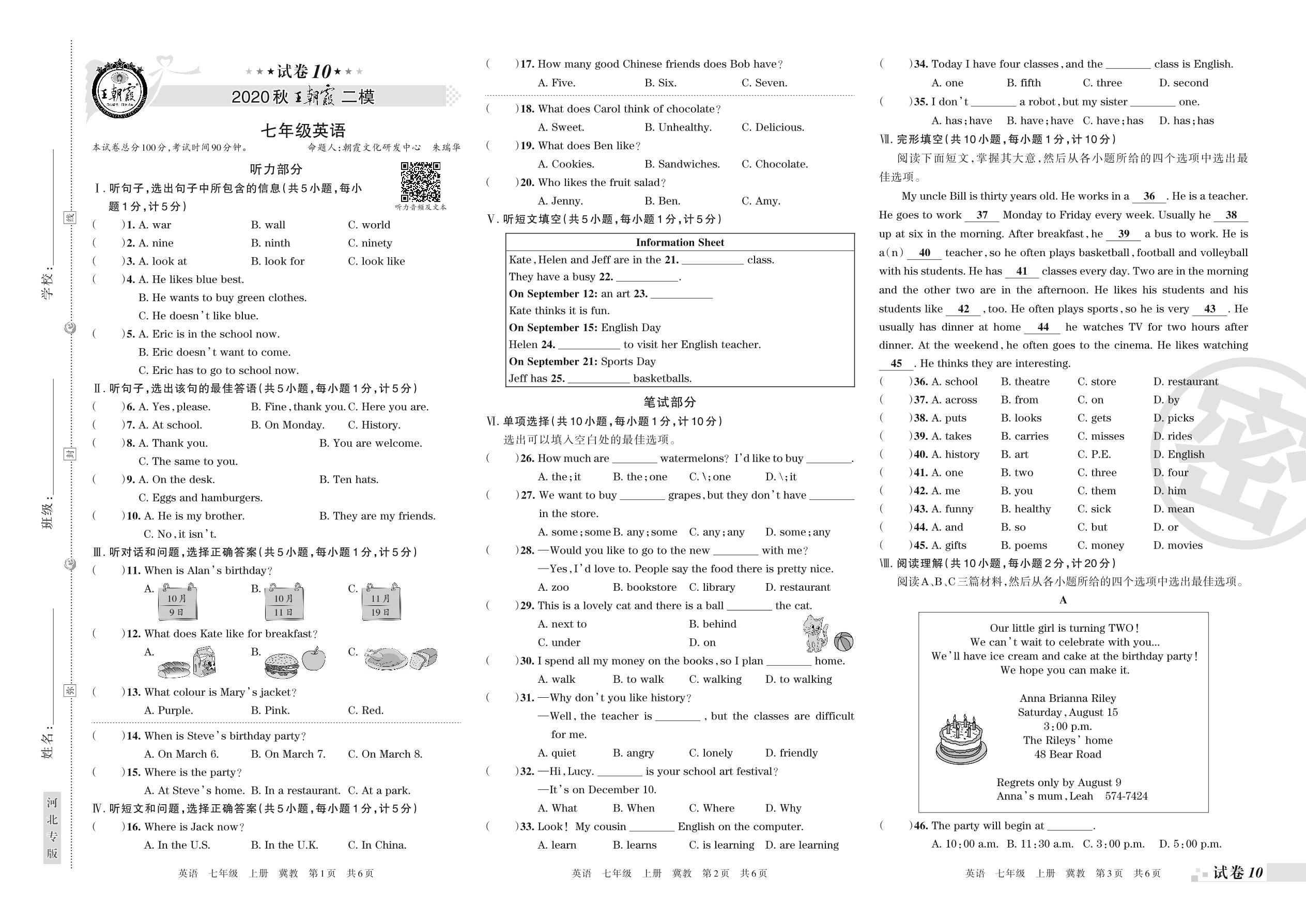 王朝霞期末模拟卷七年级上册英语(冀教版)_R210807185312【10】
