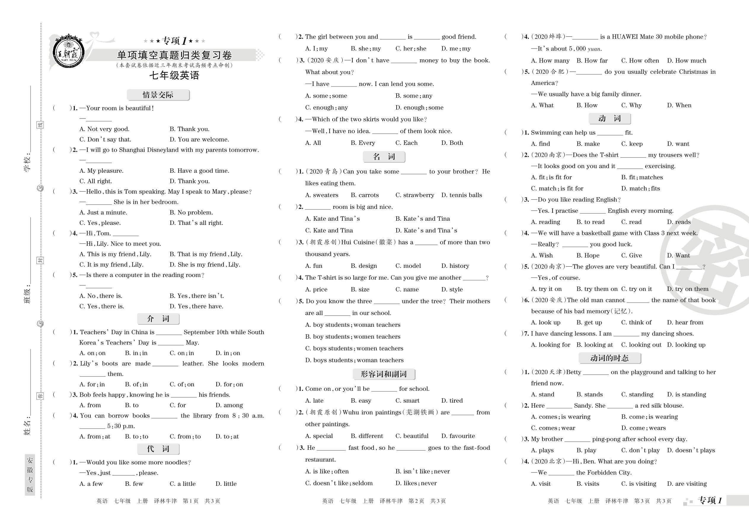 王朝霞期末专项卷——单项填空、完形填空真题归类复习七年级上册英语(译林版)