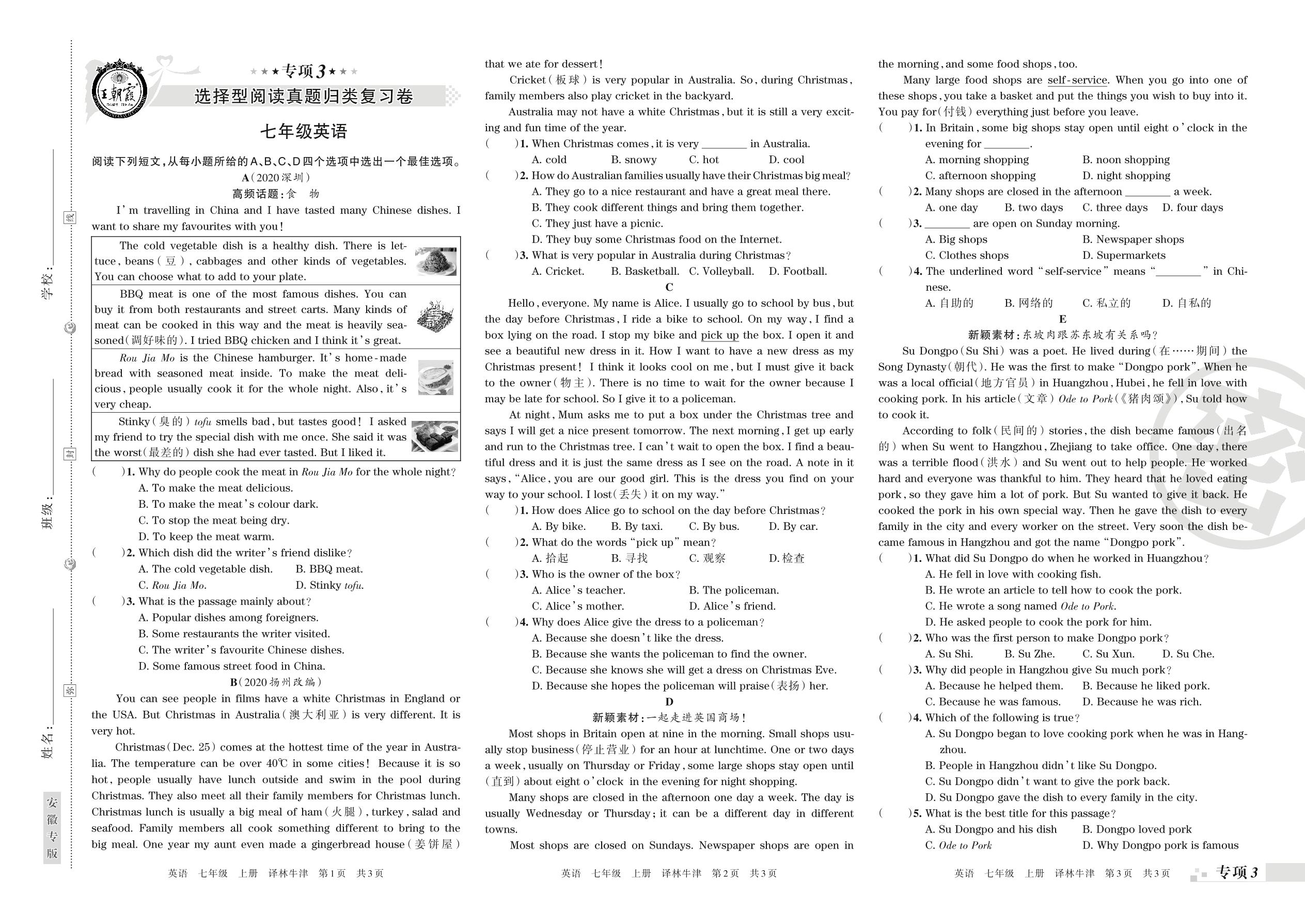 王朝霞期末专项卷——选择型阅读、任务型阅读真题归类复习七年级上册英语(译林版)