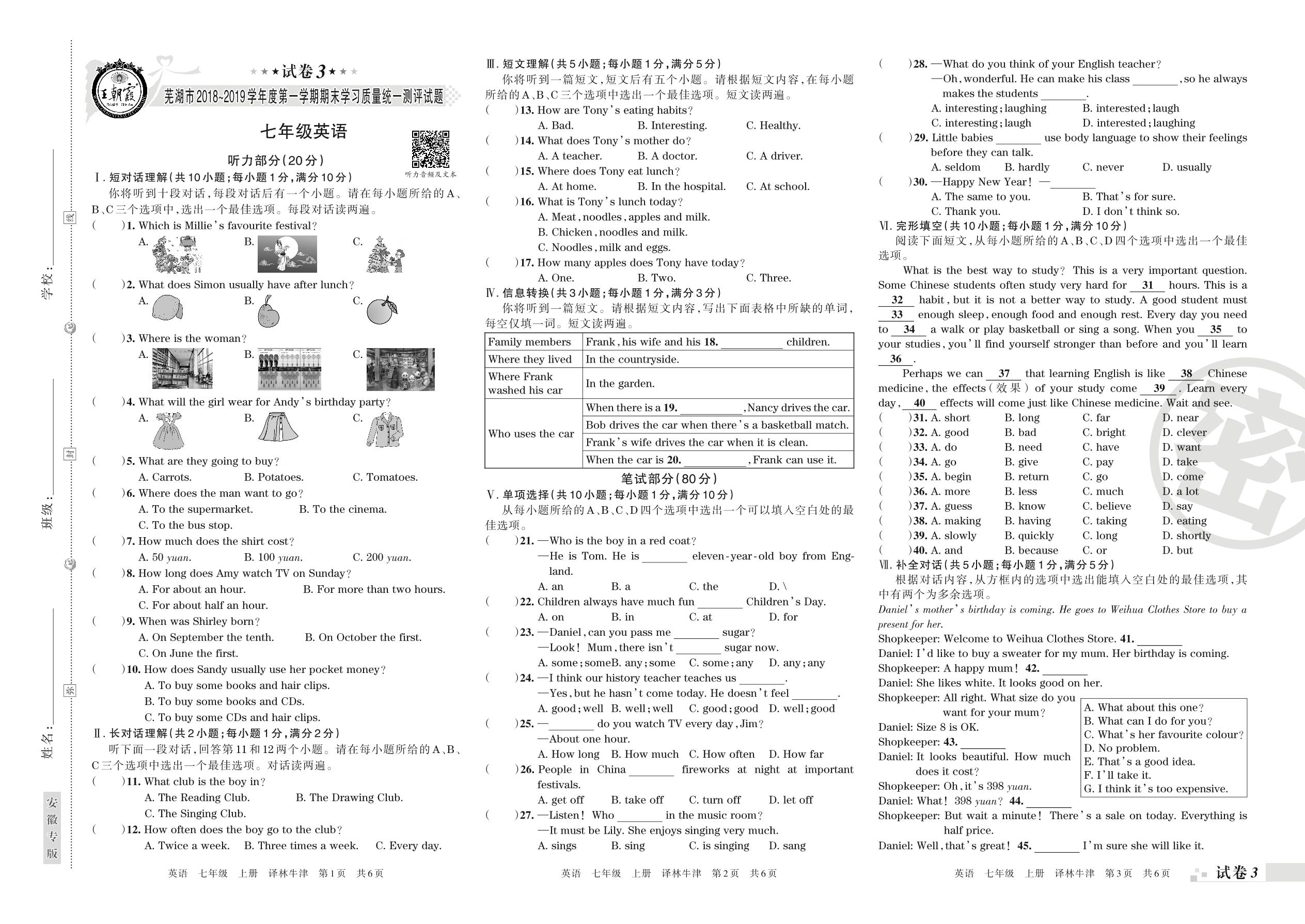 2018-2019学年第一学期芜湖市七年级英语试卷(译林版)【3】