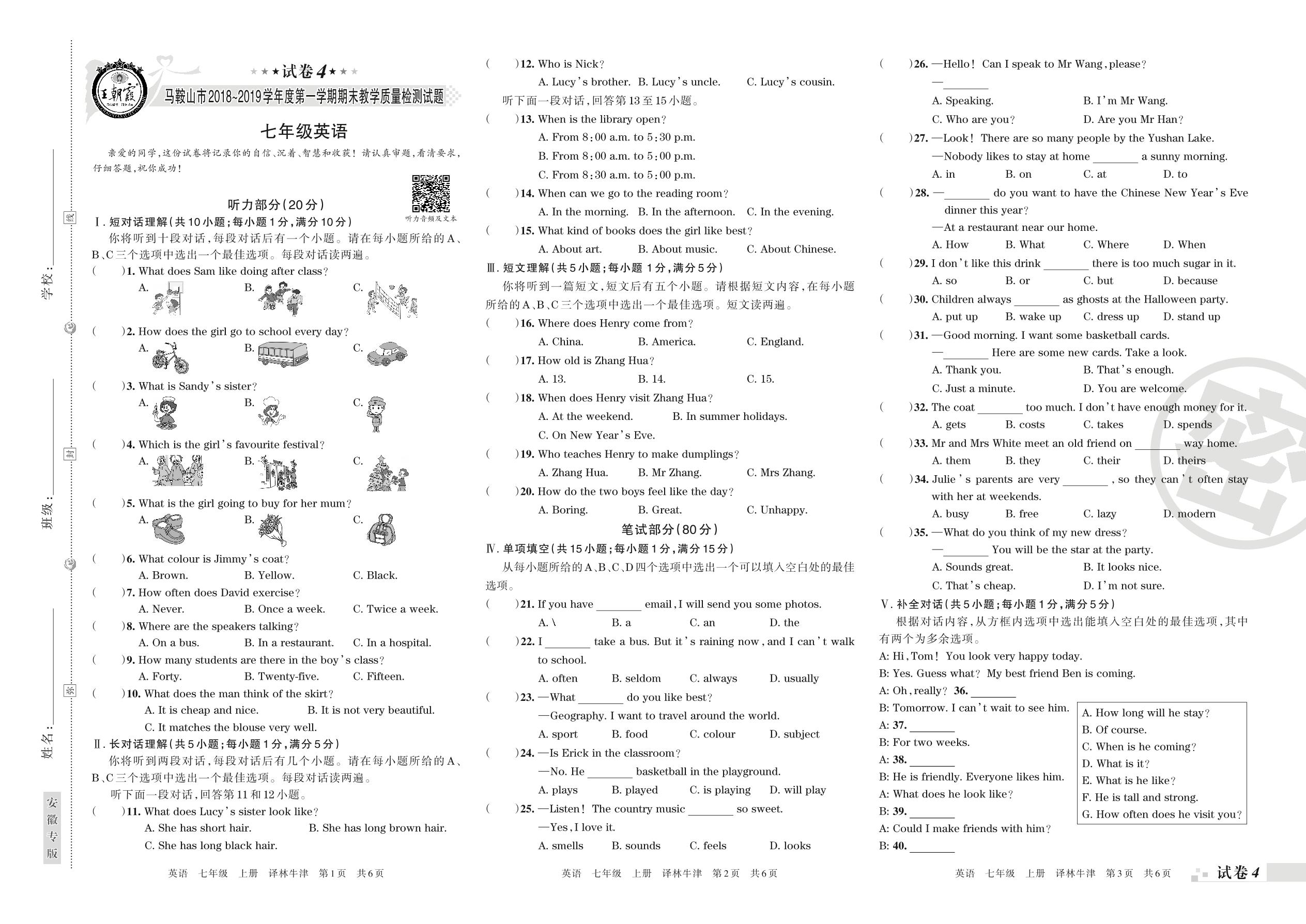 2018-2019学年第一学期马鞍山市七年级英语试卷(译林版)【4】