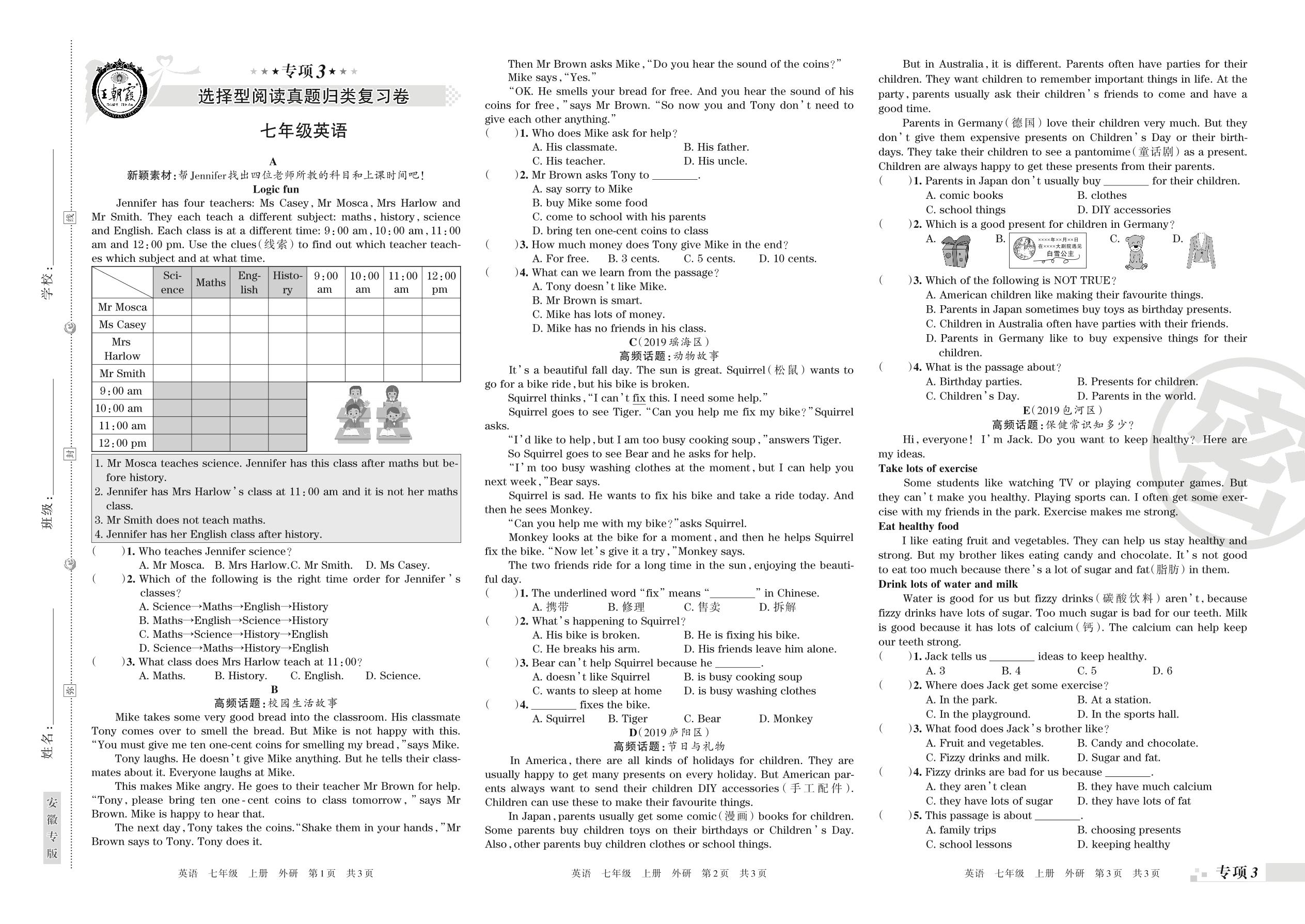 王朝霞期末专项卷——选择型阅读、任务型阅读真题归类复习七年级上册英语(外研版)