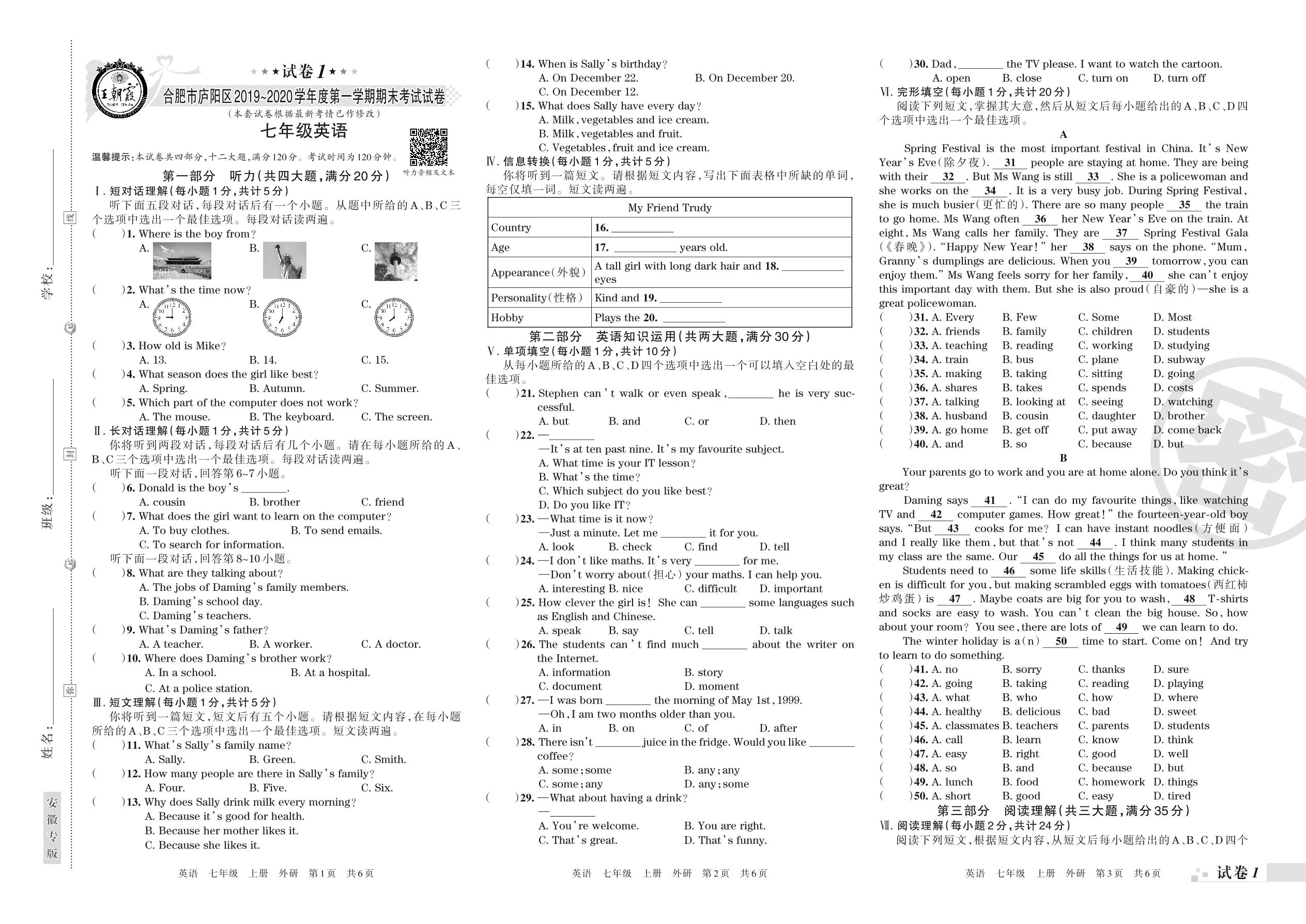 2019-2020学年第一学期合肥市庐阳区七年级英语试卷(外研版)【1】