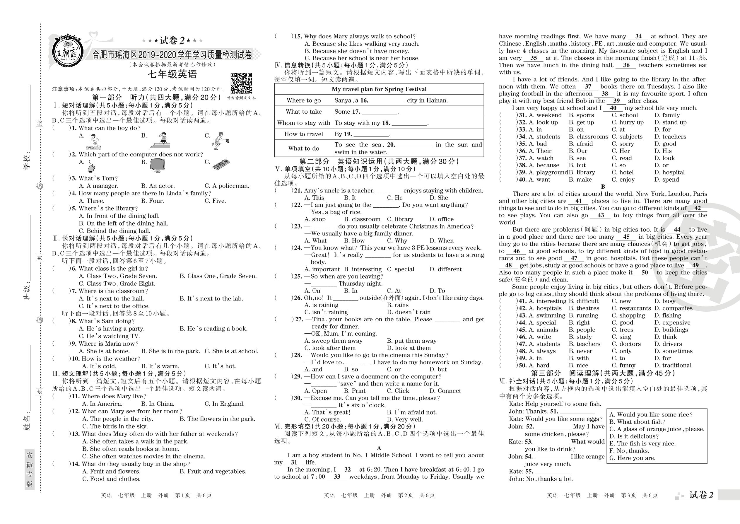2019-2020学年第一学期合肥市瑶海区七年级英语试卷(外研版)【2】
