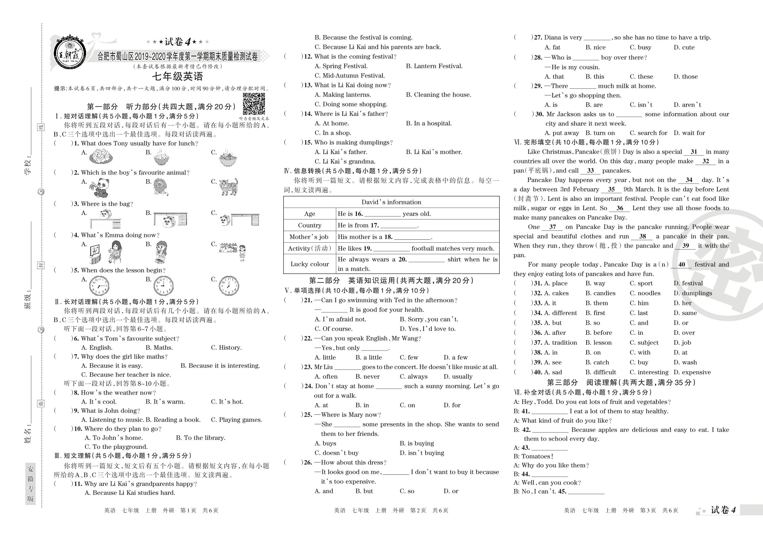 2019-2020学年第一学期合肥市蜀山区七年级英语试卷(外研版)【4】