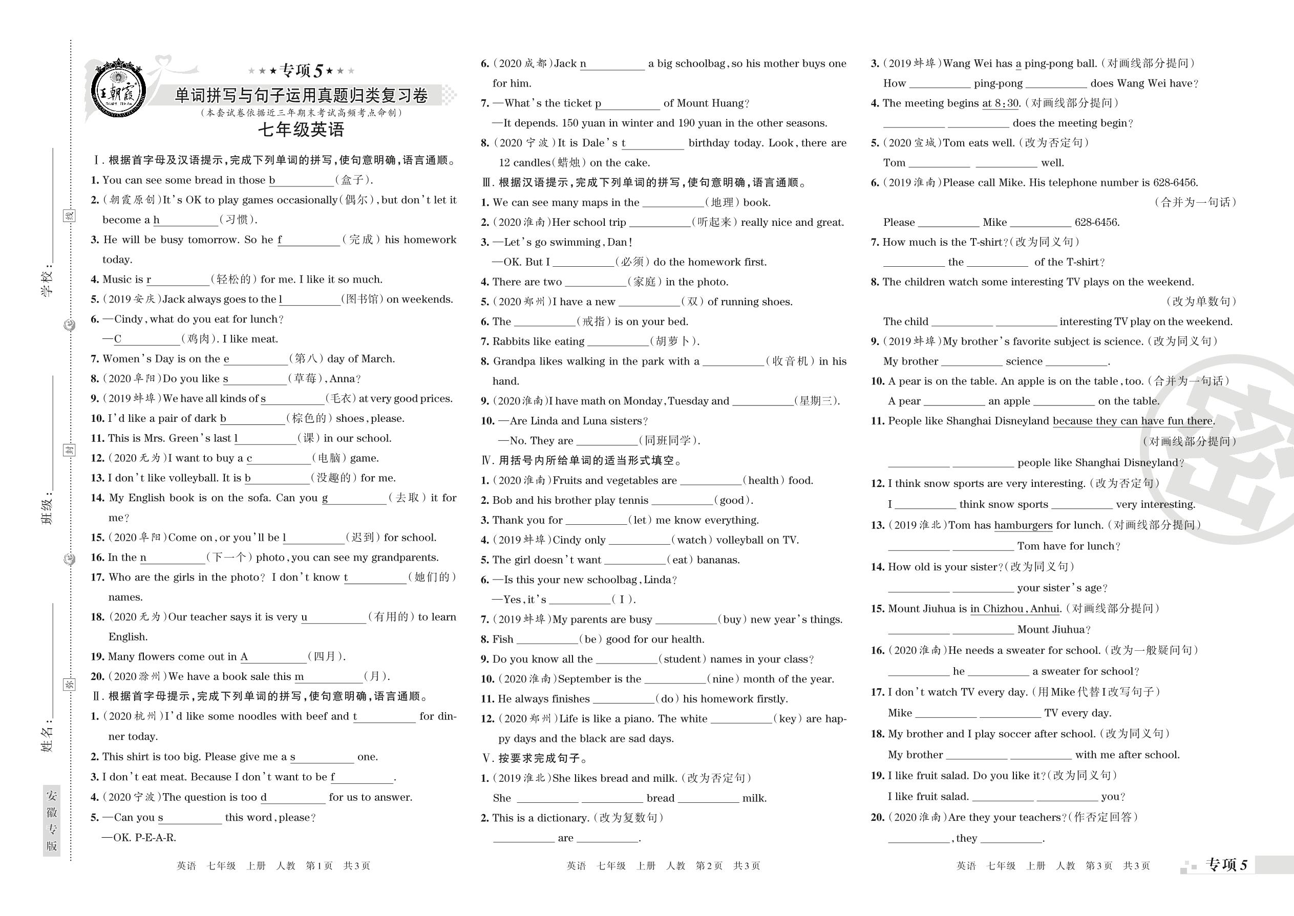 王朝霞期末专项卷——单词拼写与句子运用、书面表达真题归类复习七年级上册英语(人教版)