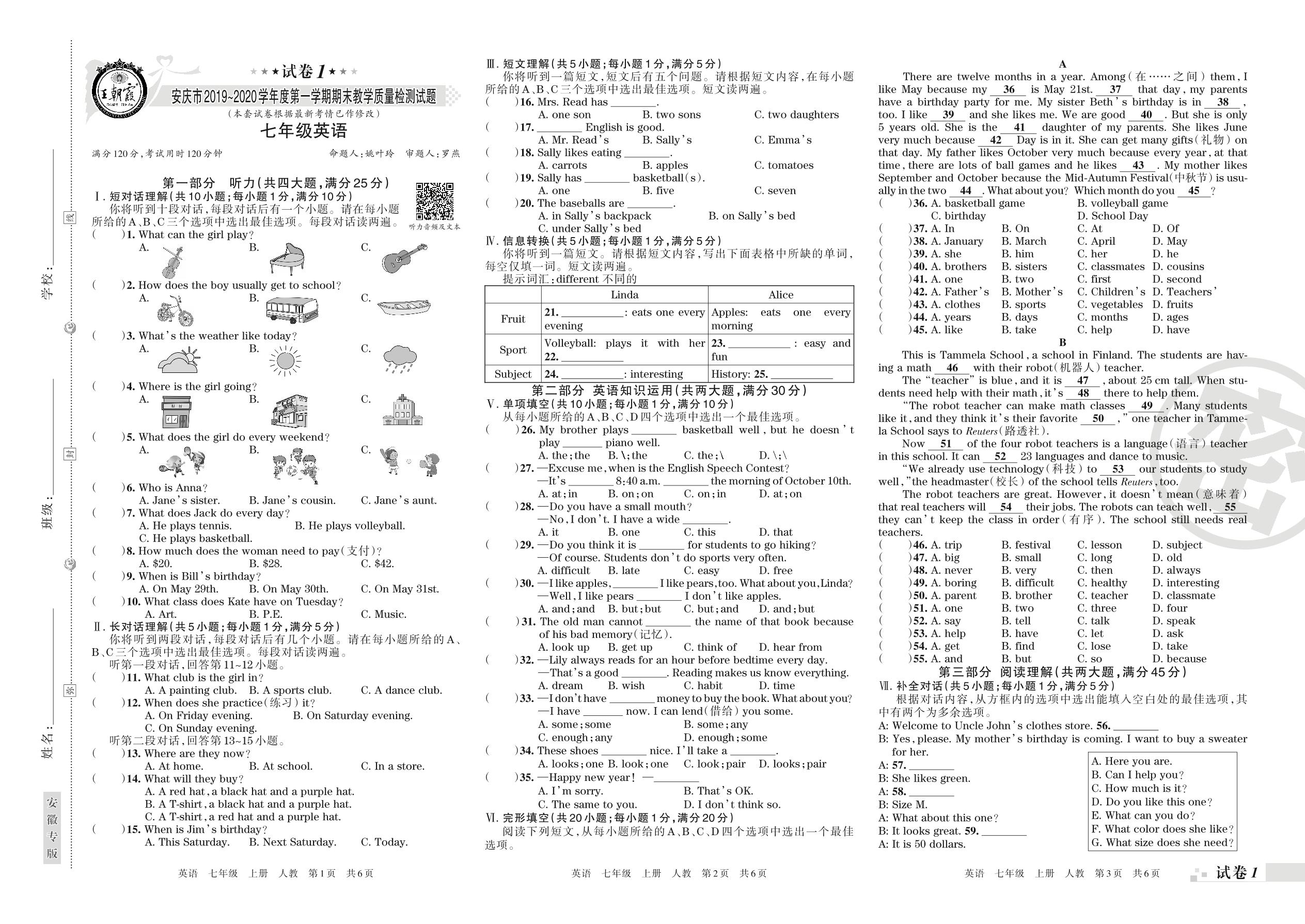2019-2020学年第一学期安庆市七年级英语试卷(人教版)【1】