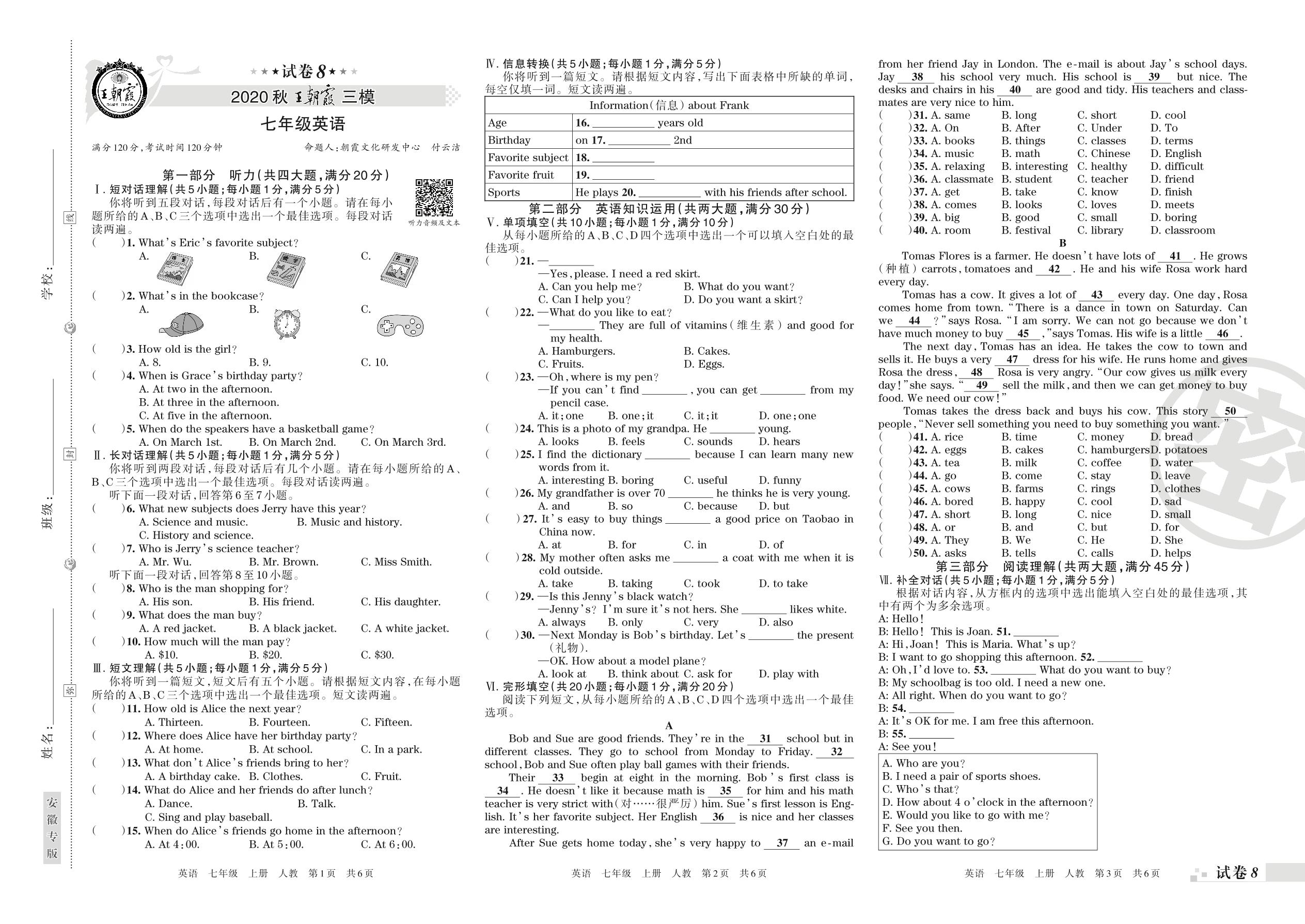 王朝霞期末模拟卷七年级上册英语(人教版)_R210807185909【8】