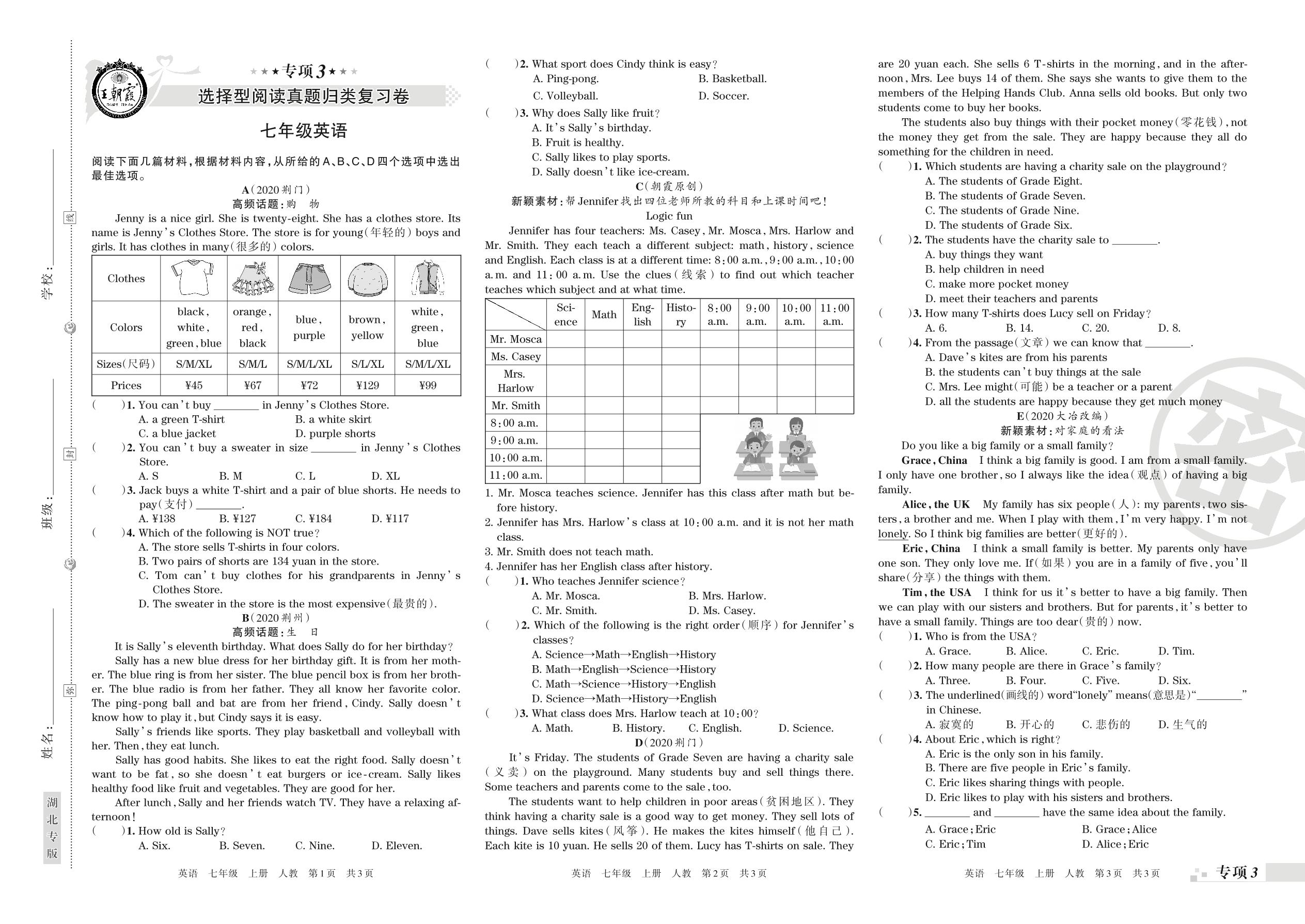 王朝霞期末专项卷——选择型阅读、任务型阅读真题归类复习七年级上册英语(人教版)_R210807185943【0】