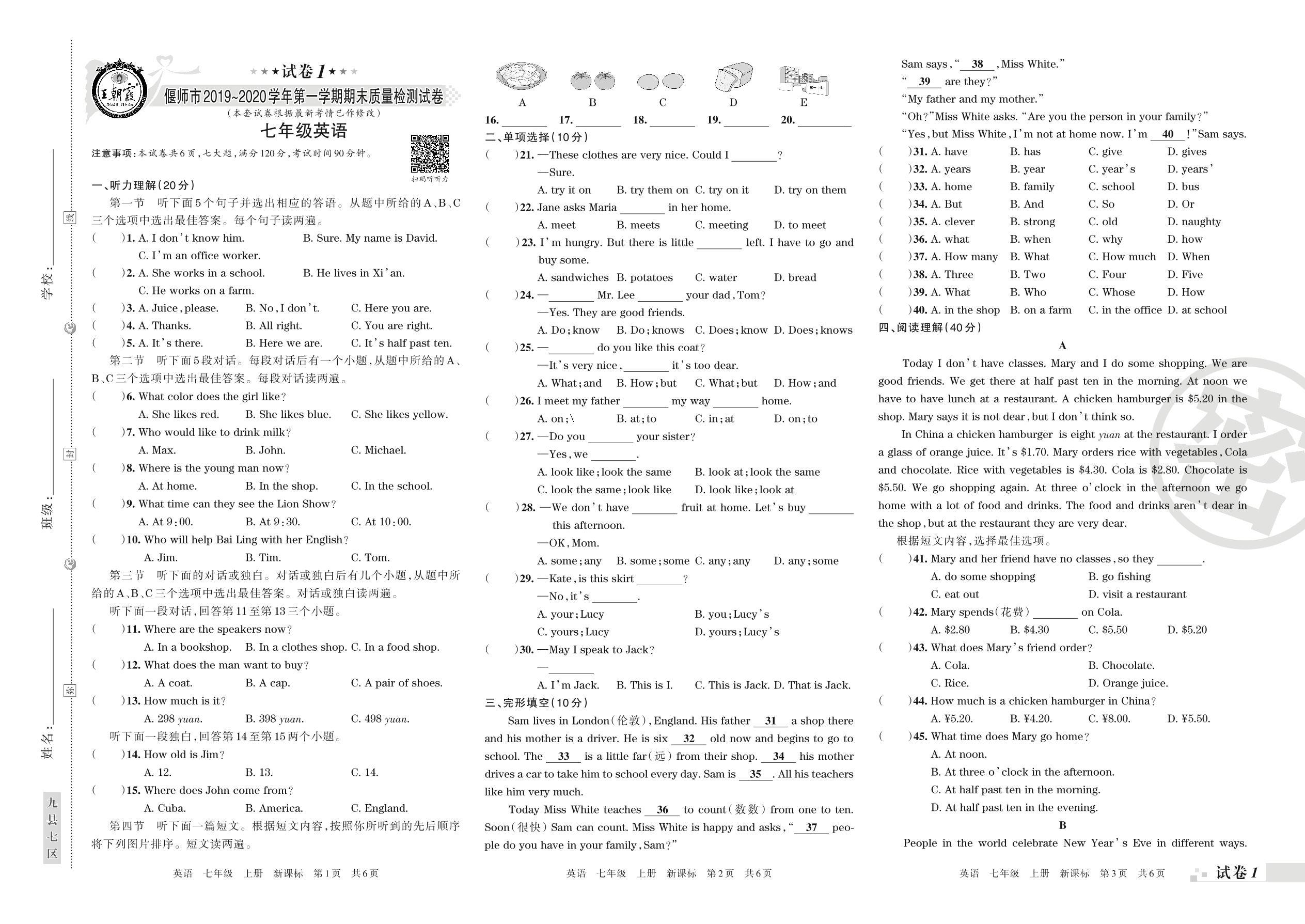 2019-2020学年第一学期偃师市七年级英语试卷(新课版)【1】