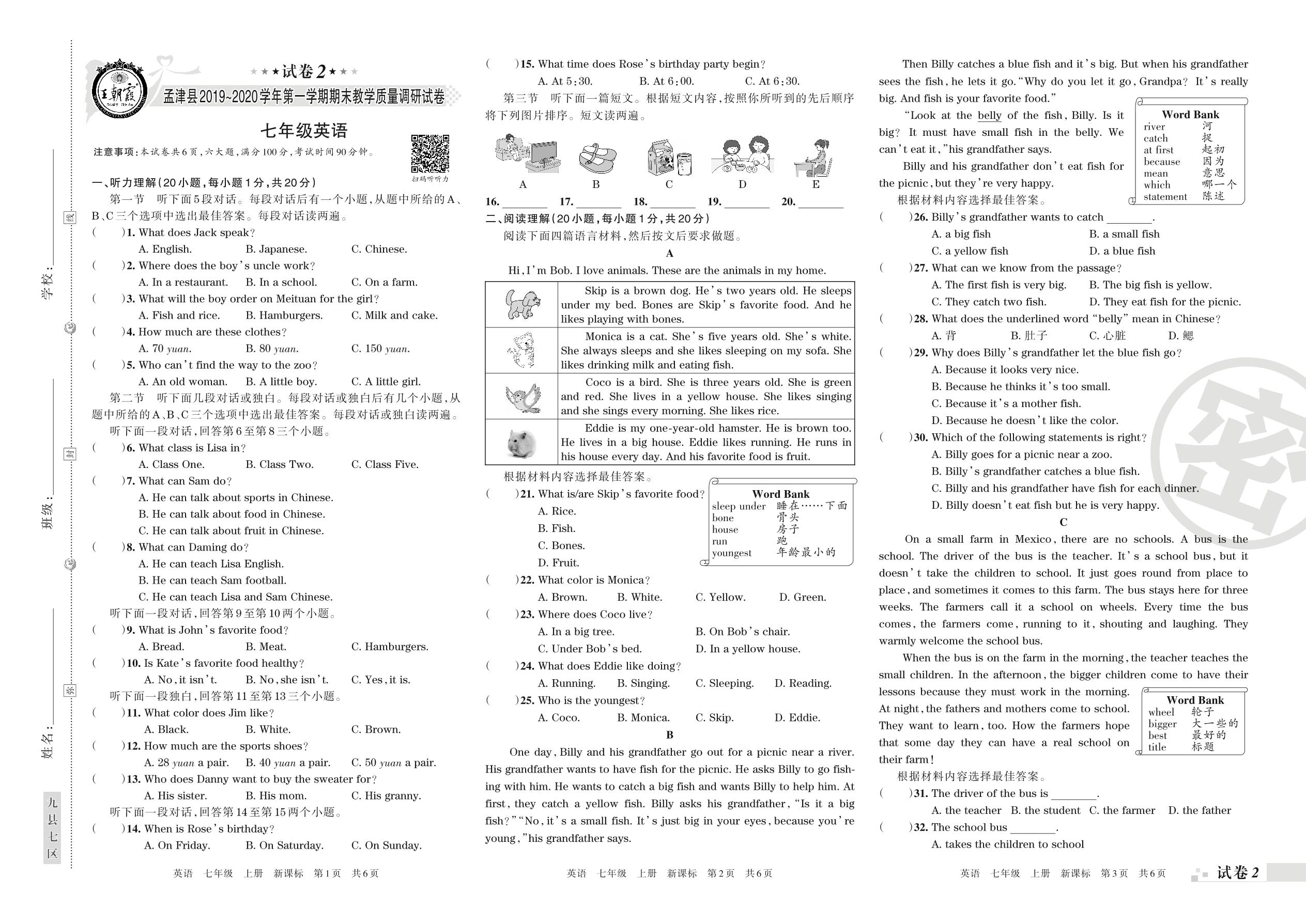 2019-2020学年第一学期洛阳市孟津县七年级英语试卷(新课版)【2】