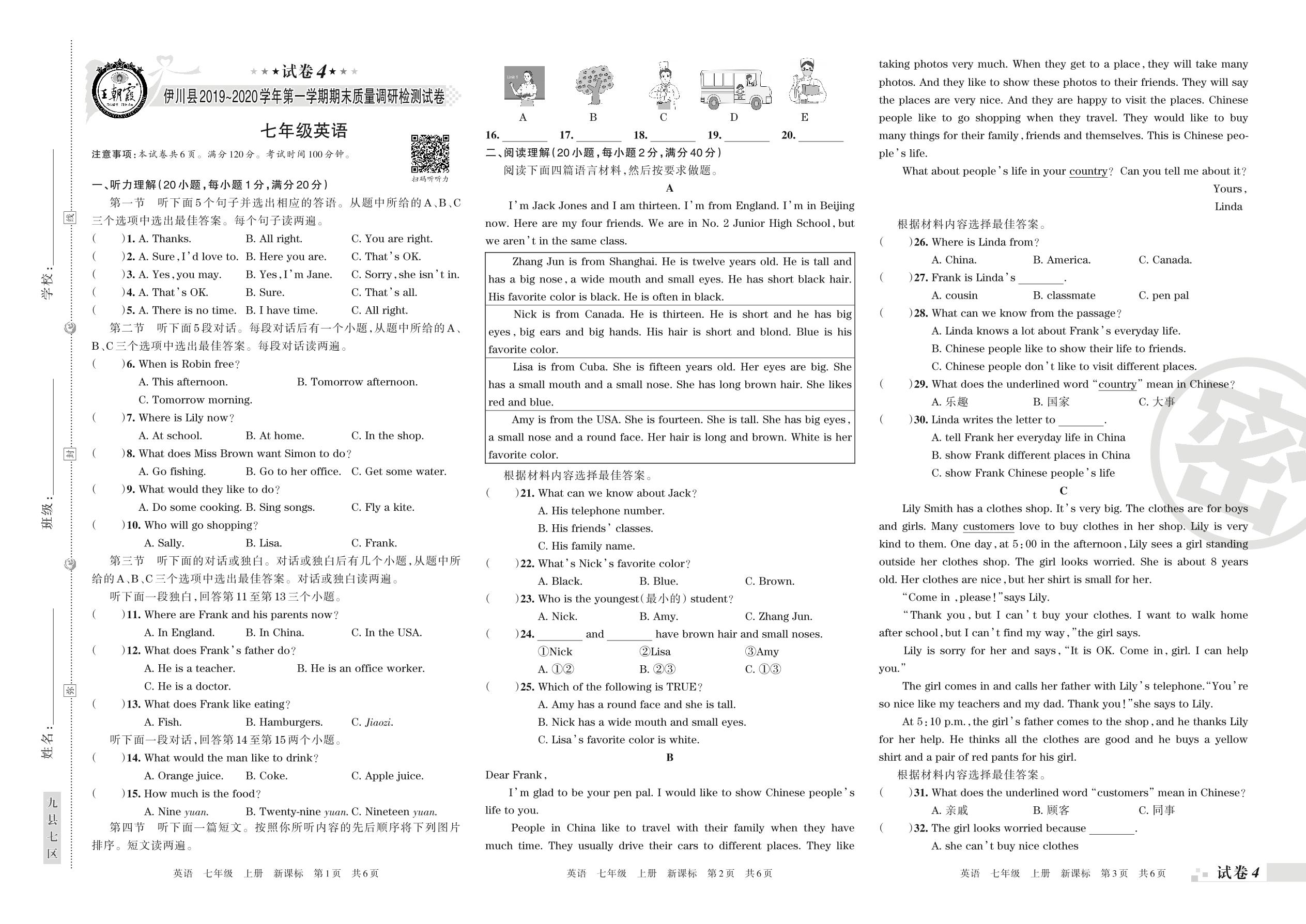 2019-2020学年第一学期洛阳市伊川县七年级英语试卷(新课版)【4】