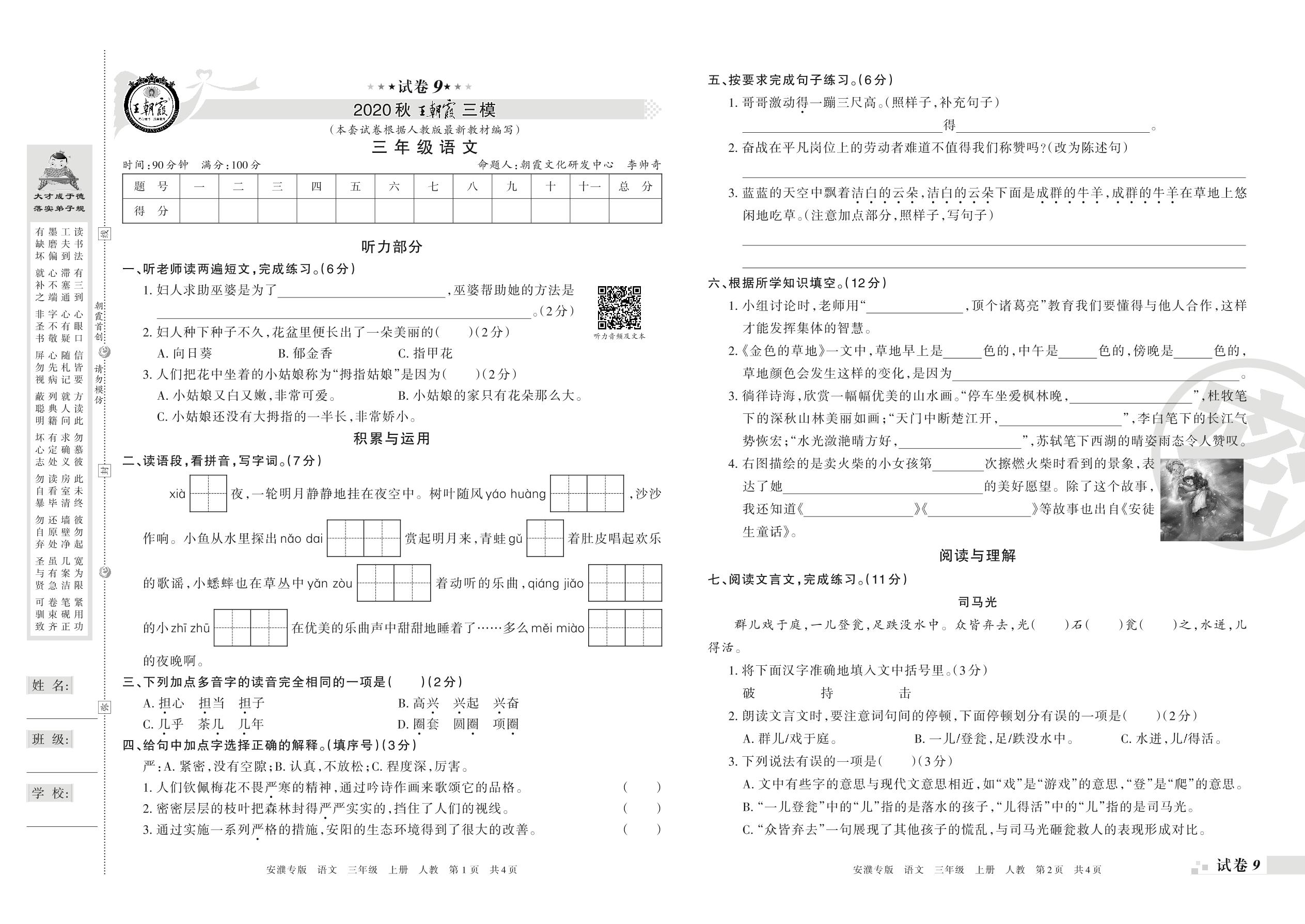 王朝霞期末模拟卷三年级上册语文(人教版)_R21080185137【9】