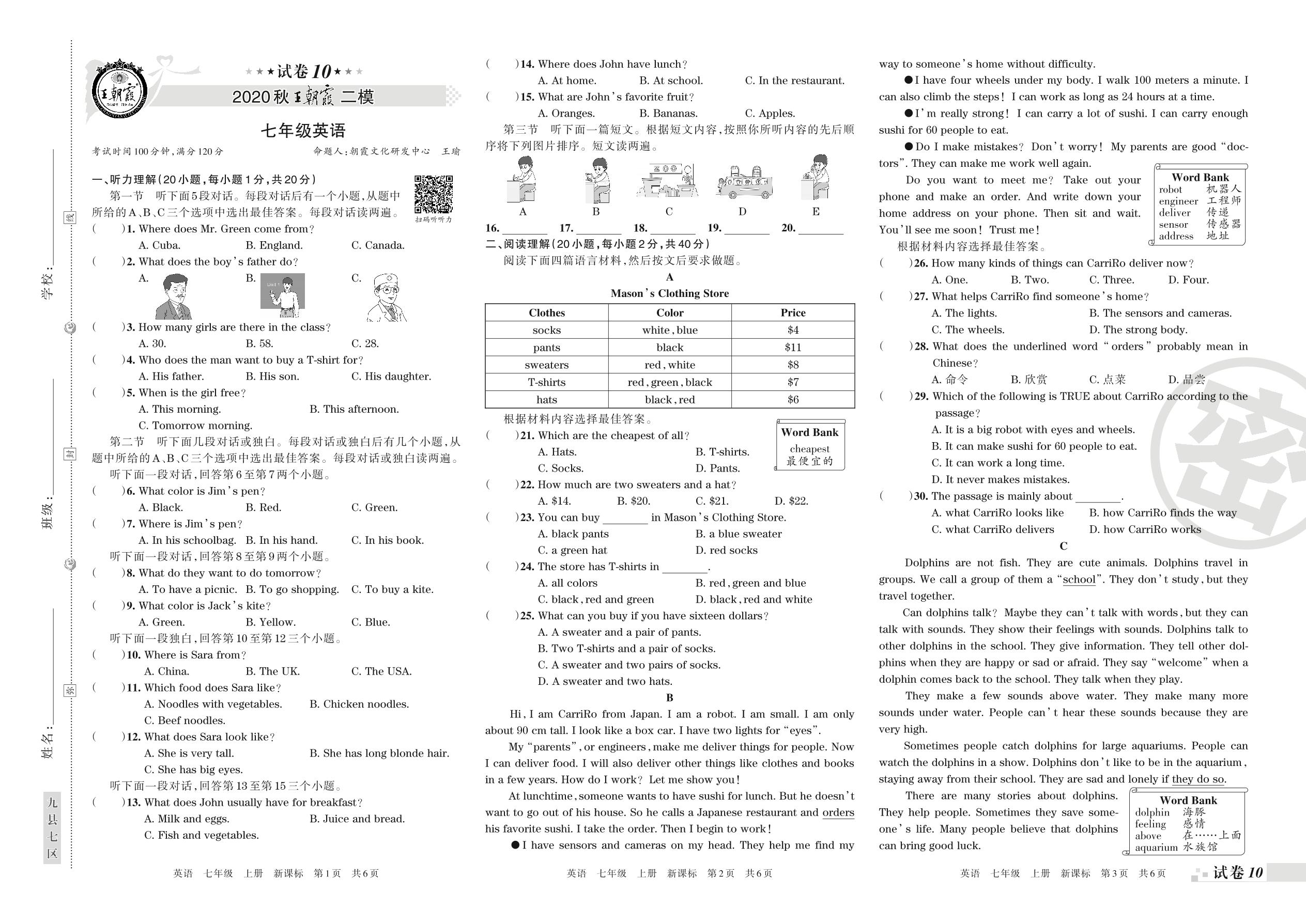 王朝霞期末模拟卷七年级上册英语(新课版)_R210807190312【10】