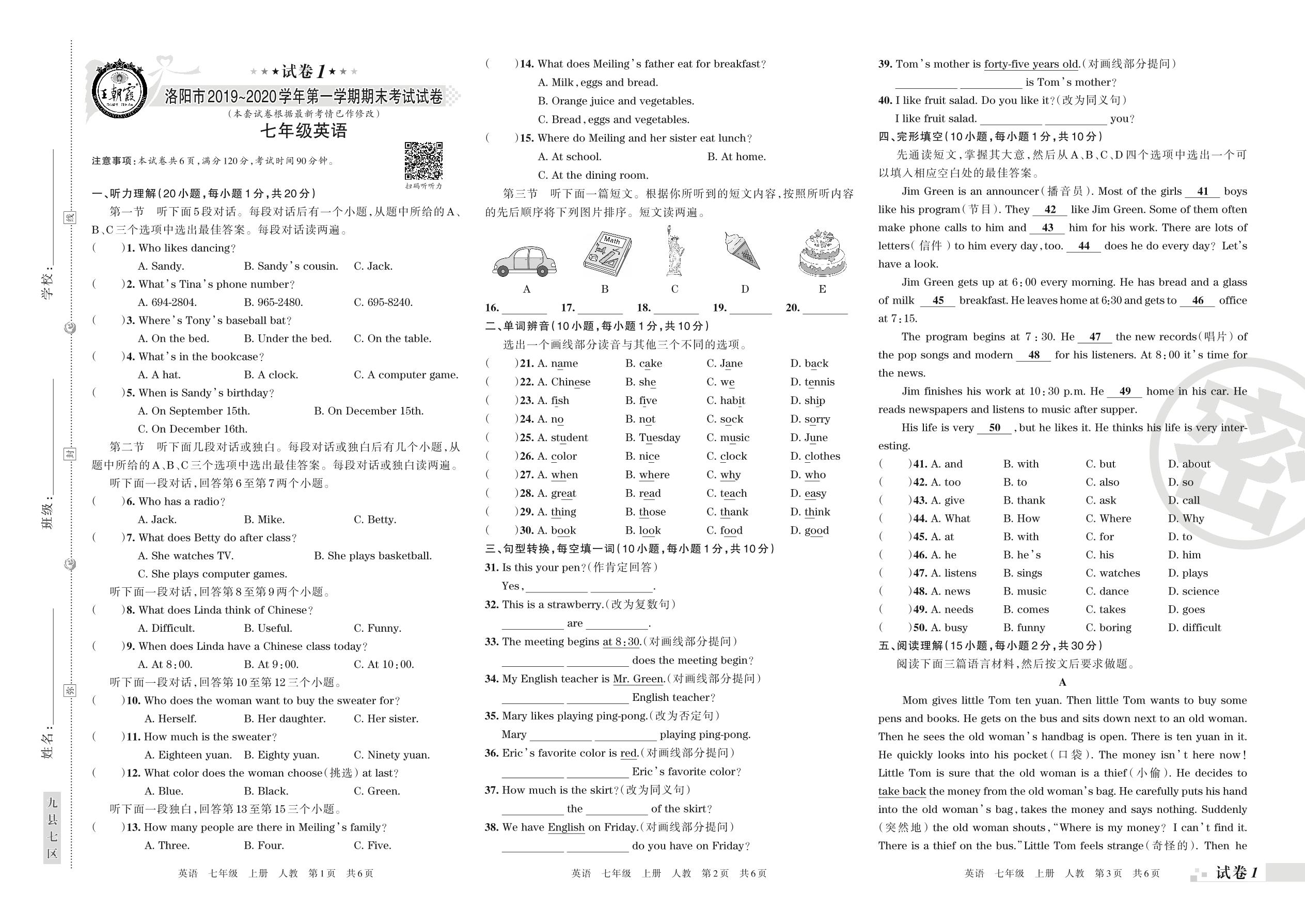 2019-2020学年第一学期洛阳市七年级英语试卷(人教版)【1】