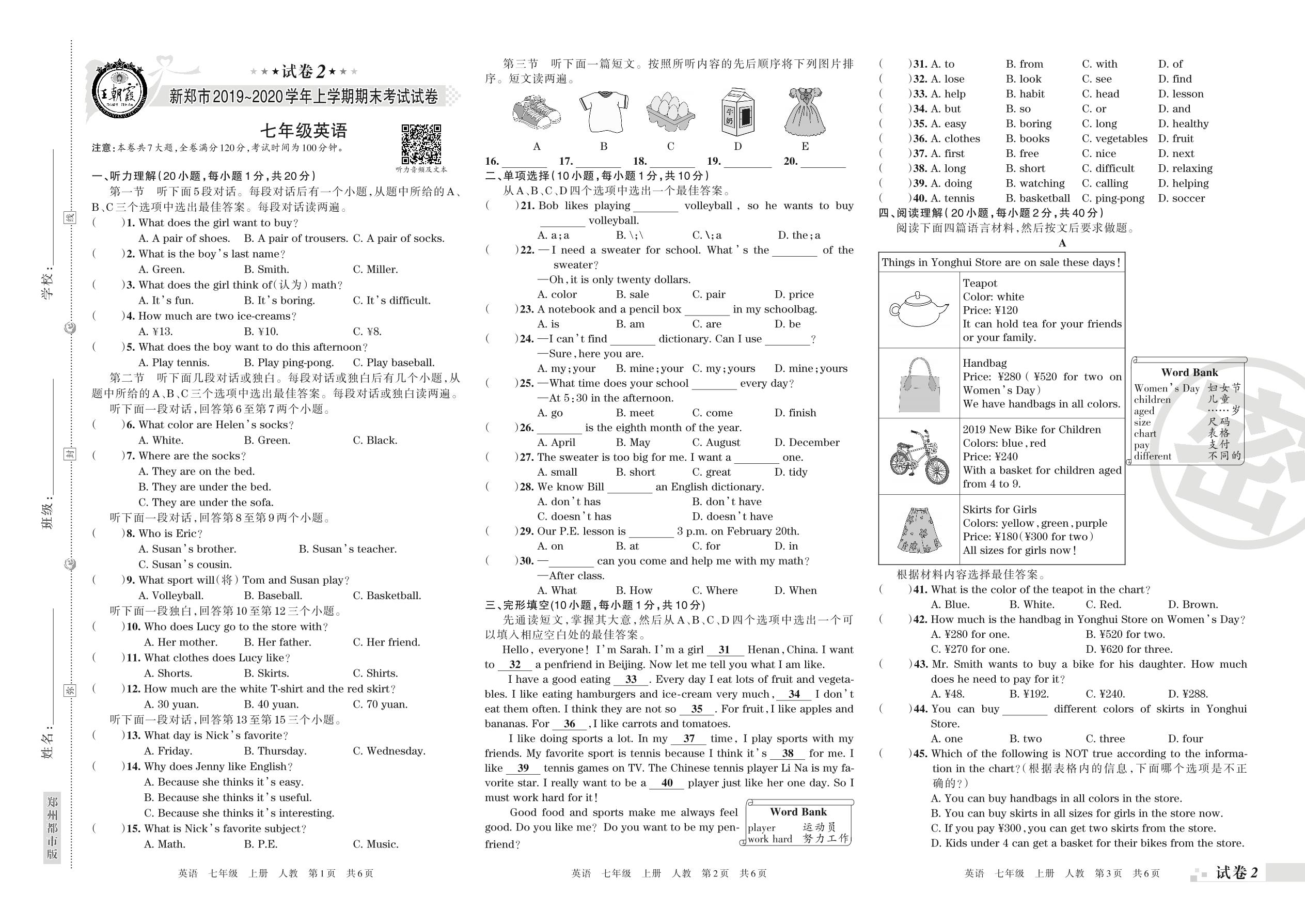 2019-2020学年第一学期新郑市七年级英语试卷(人教版)【2】