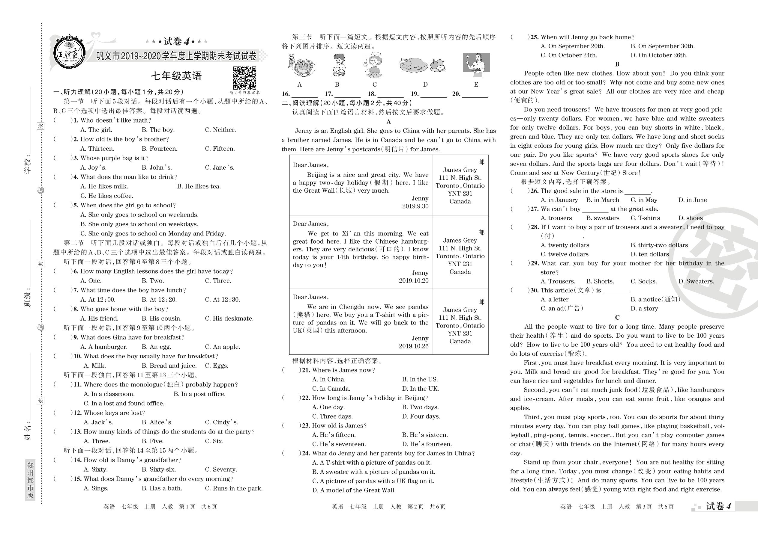 2019-2020学年第一学期巩义市七年级英语试卷(人教版)【4】