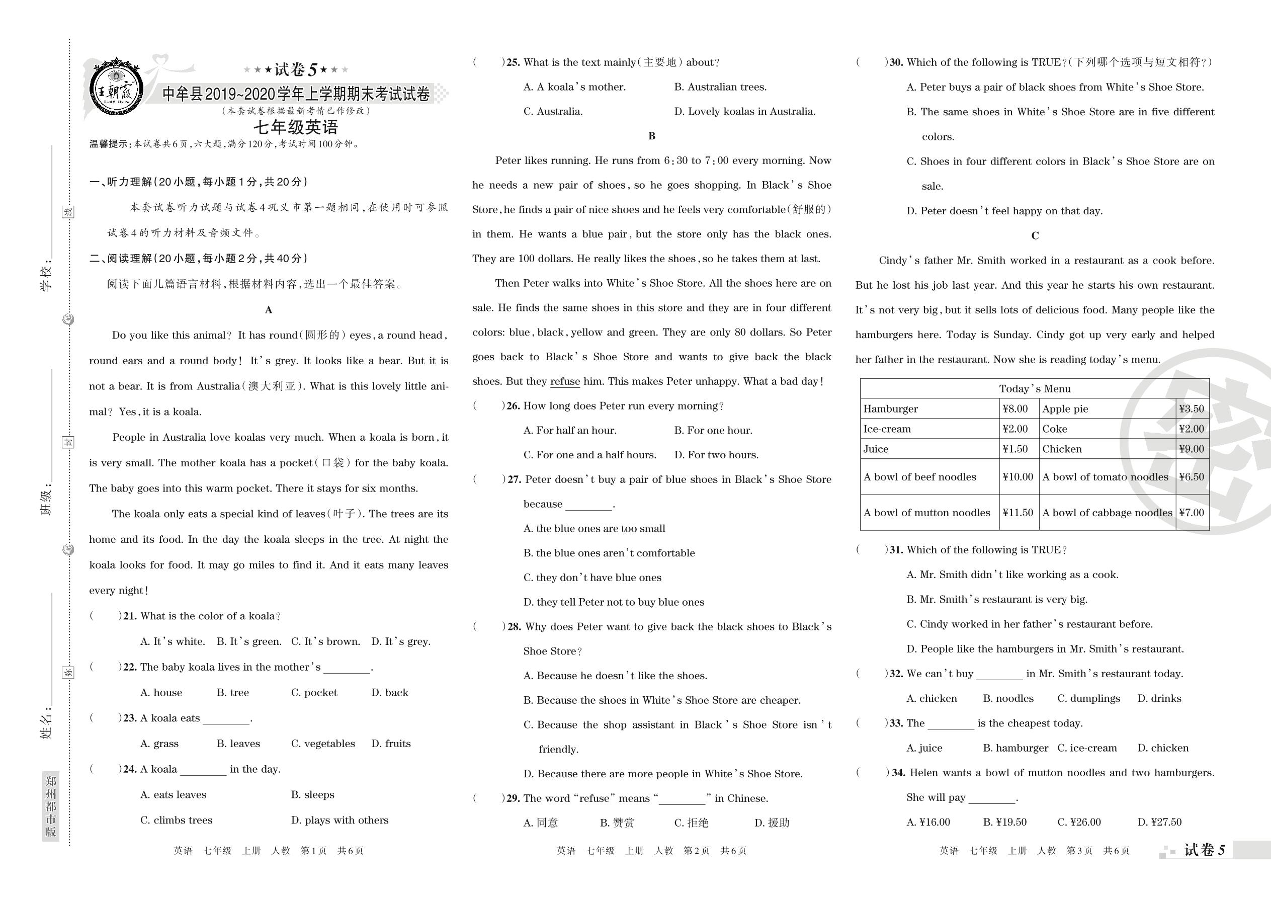 2019-2020学年第一学期郑州市中牟县七年级英语试卷(人教版)【5】