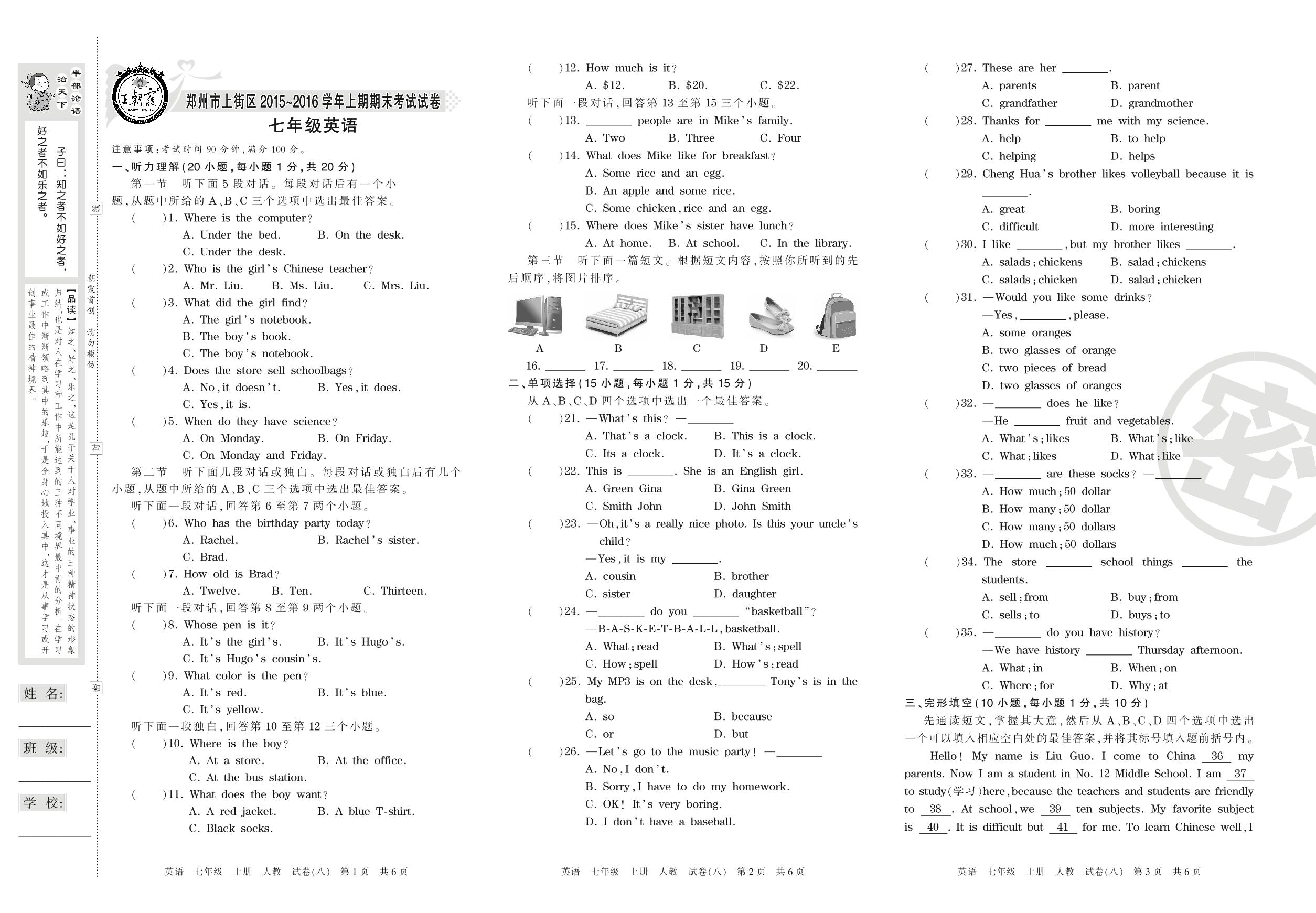 2015-2016学年第一学期郑州市上街区七年级英语试卷(人教版)【8】