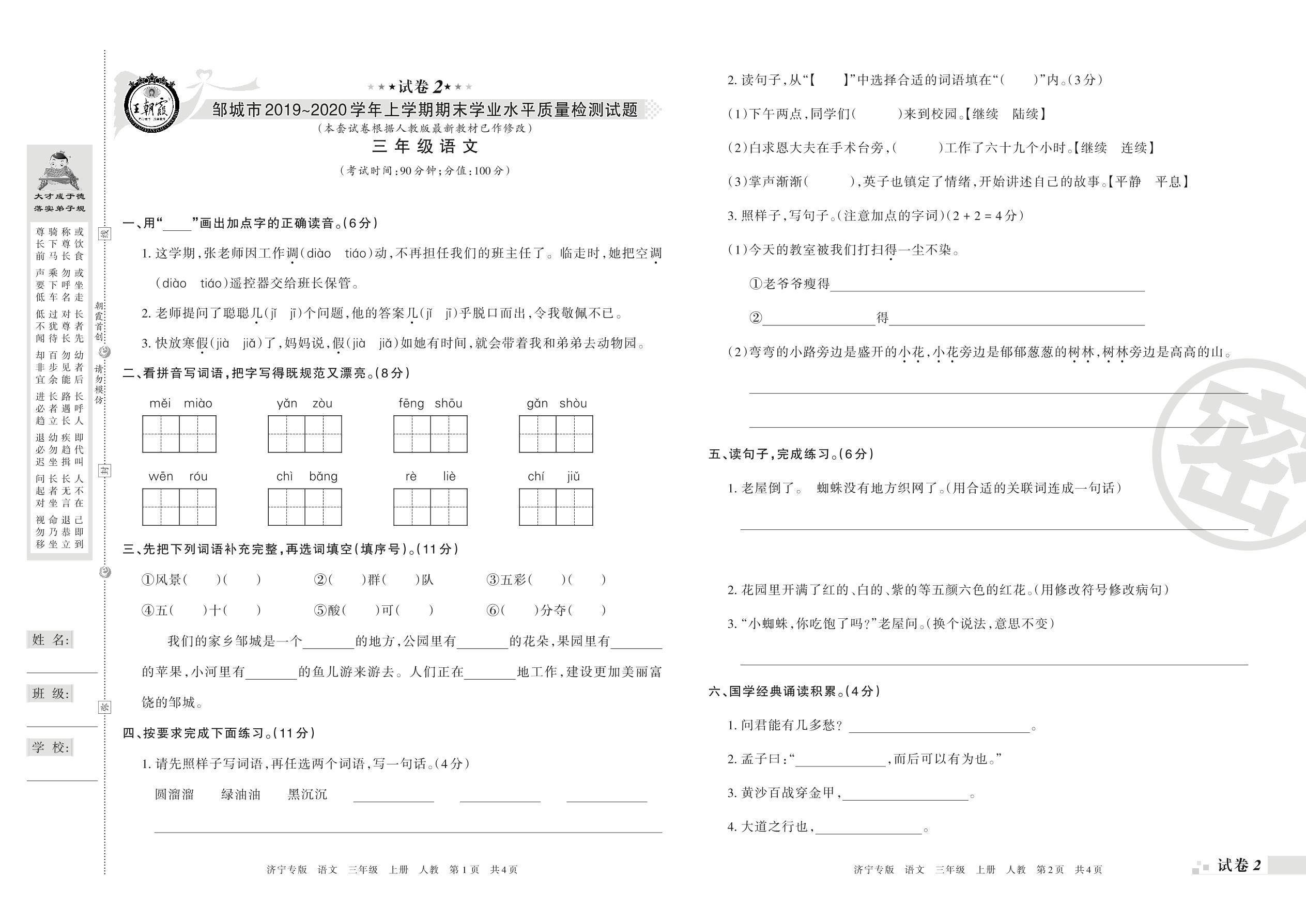 2019-2020学年第一学期邹城市三年级语文试卷(人教版)【2】