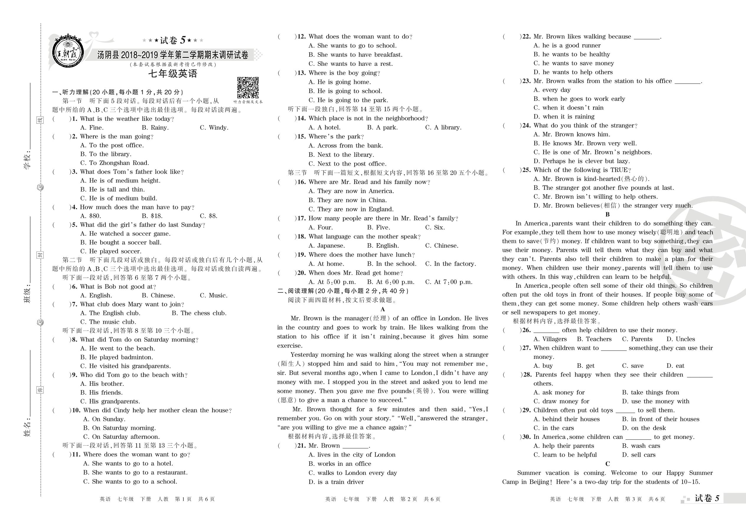 2018-2019学年第二学期安阳市汤阴县七年级英语试卷(人教版)【5】