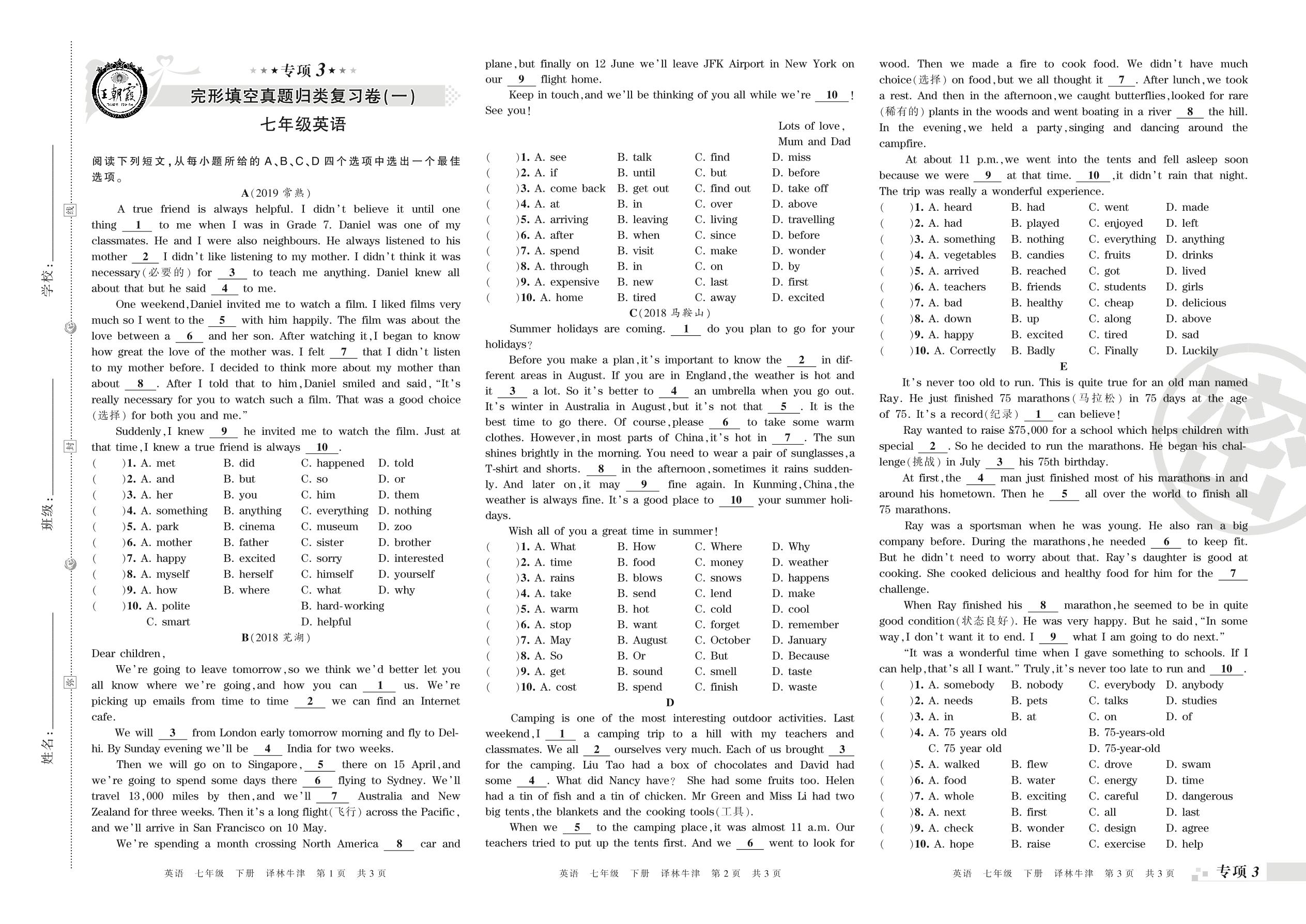 王朝霞期末专项卷——完形填空(一)(二)真题归类复习卷七年级下册英语(译林版)_R210807191308【0】
