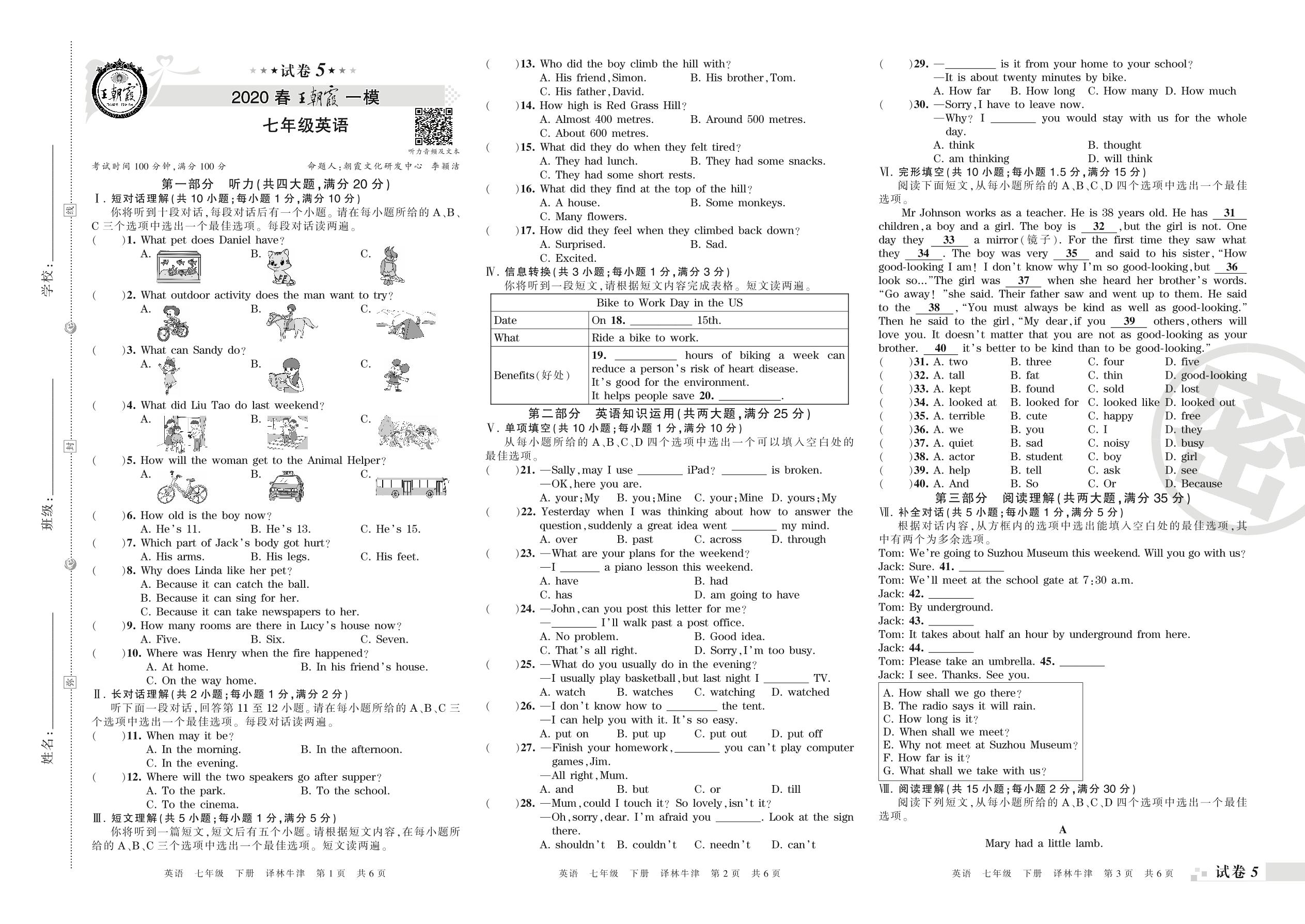 王朝霞期末模拟卷七年级下册英语(译林版)_R210807191403【5】