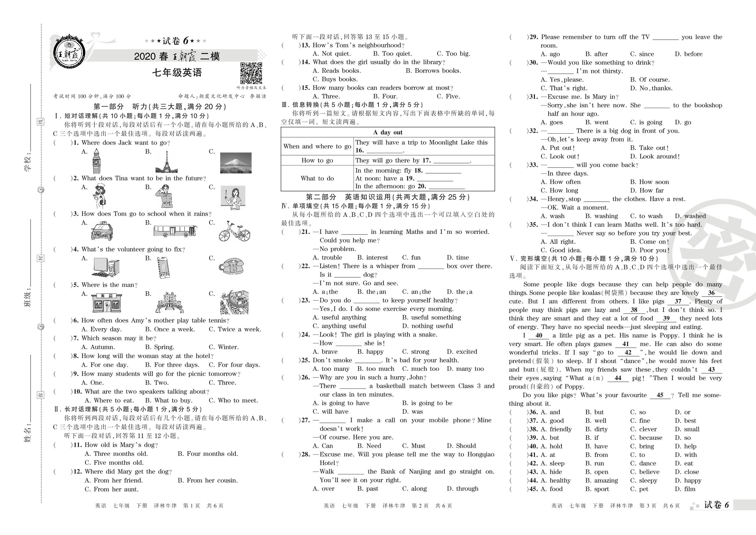 王朝霞期末模拟卷七年级下册英语(译林版)_R210807191412【6】