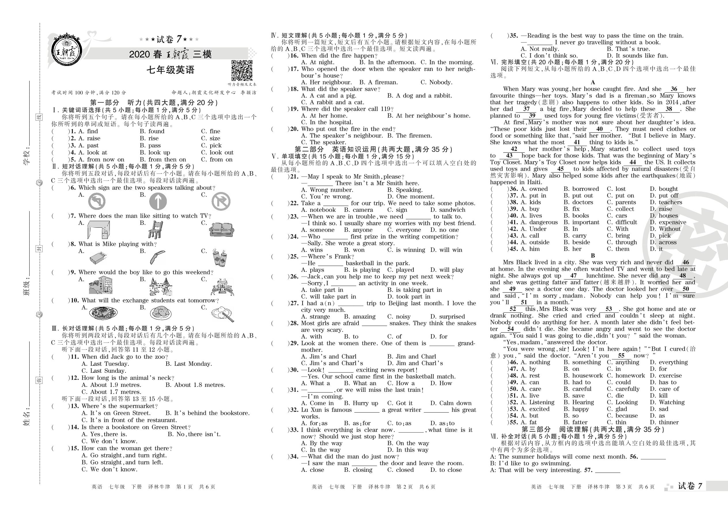 王朝霞期末模拟卷七年级下册英语(译林版)_R210807191421【7】