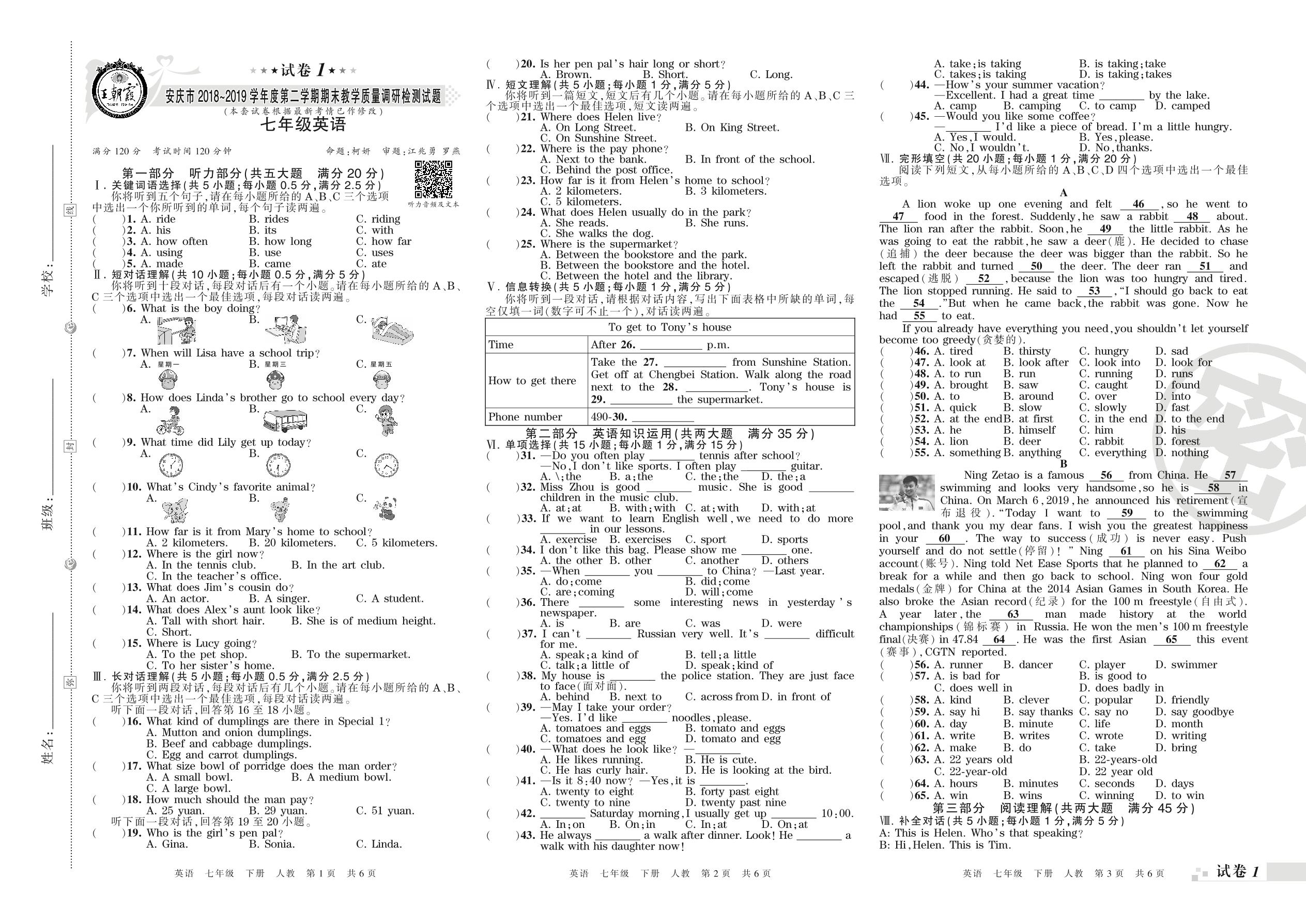 2018-2019学年第二学期安庆市七年级英语试卷(人教版)【1】