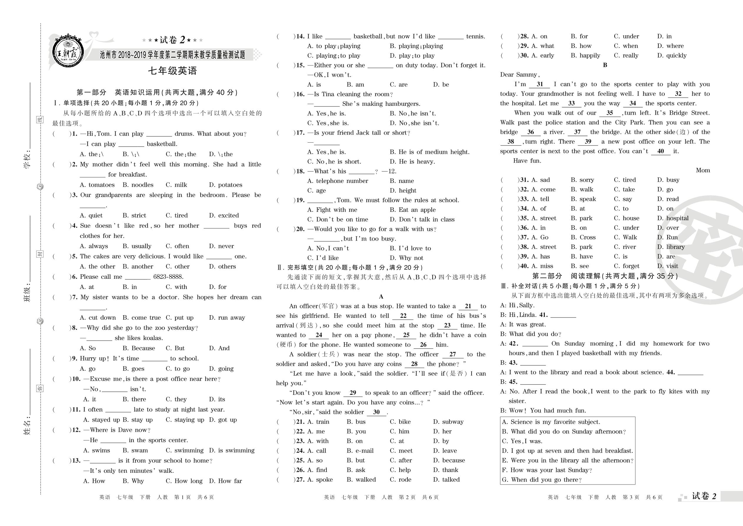2018-2019学年第二学期池州市七年级英语试卷(人教版)【2】