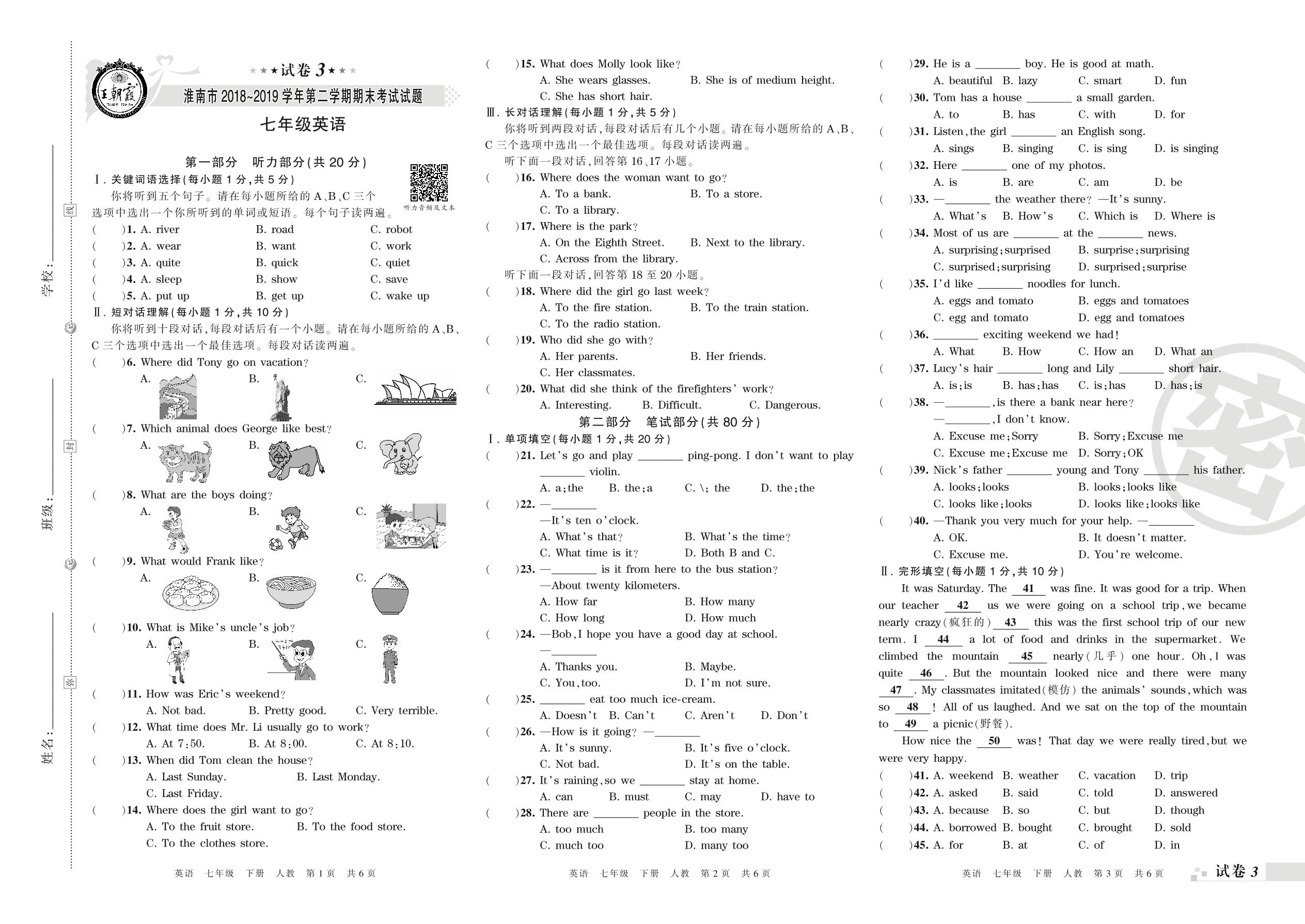 2018-2019学年第二学期淮南市七年级英语试卷(人教版)【3】