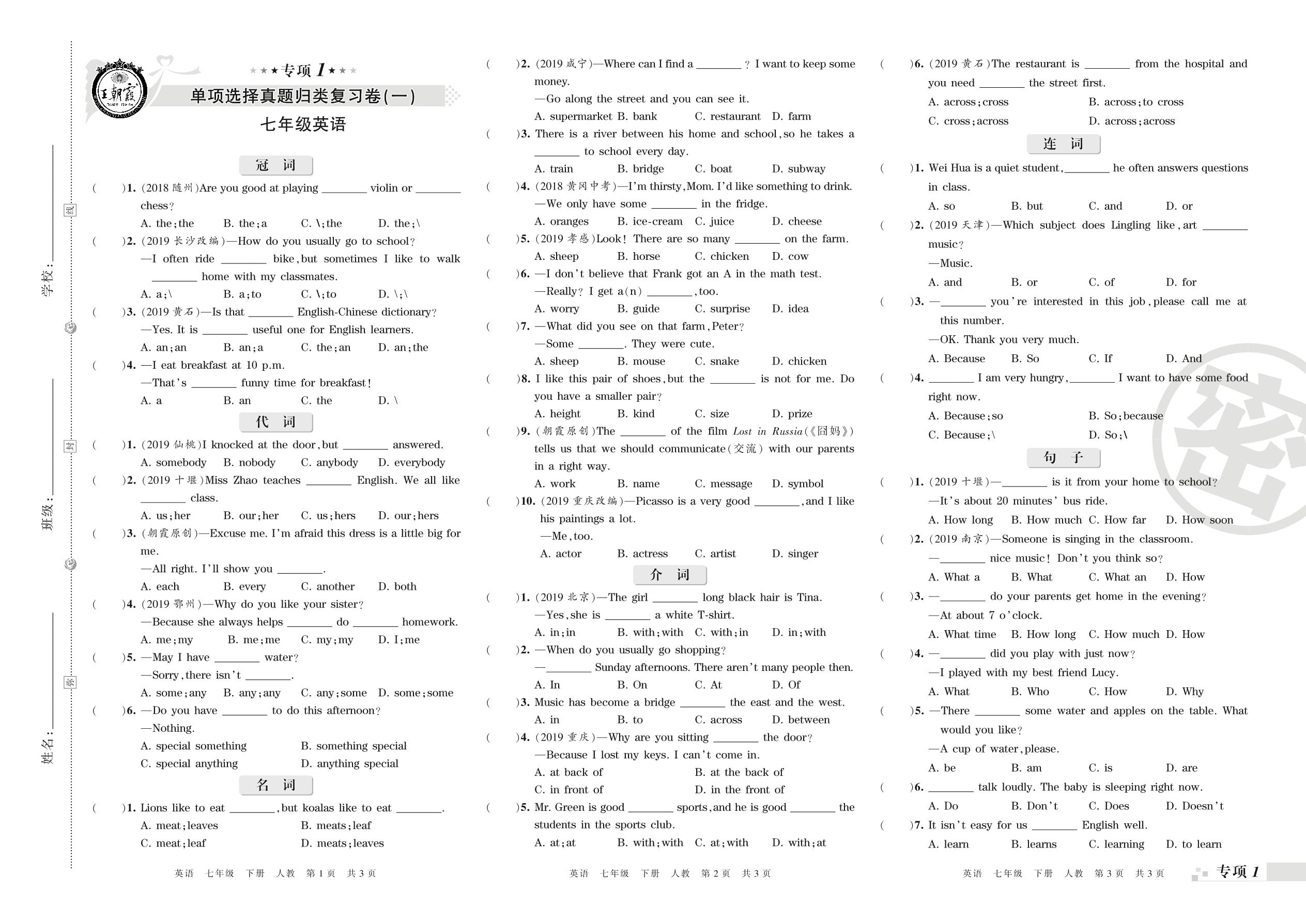 王朝霞期末专项卷——单项选择(一)(二)真题归类复习卷七年级下册英语(人教版)_R210807191923【0】