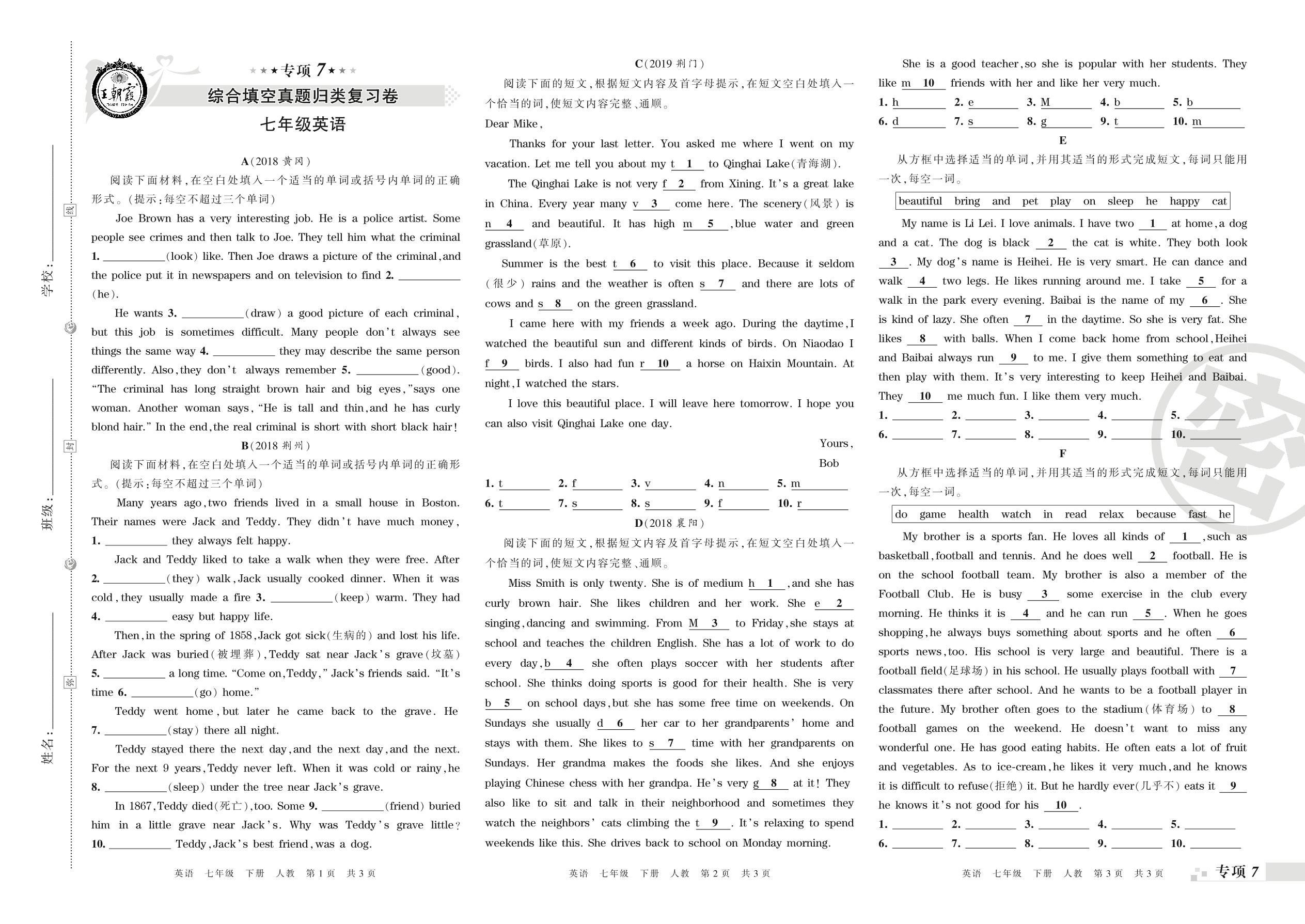 王朝霞期末专项卷——综合填空、书面表达真题归类复习卷七年级下册英语(人教版)_R210807191944【0】