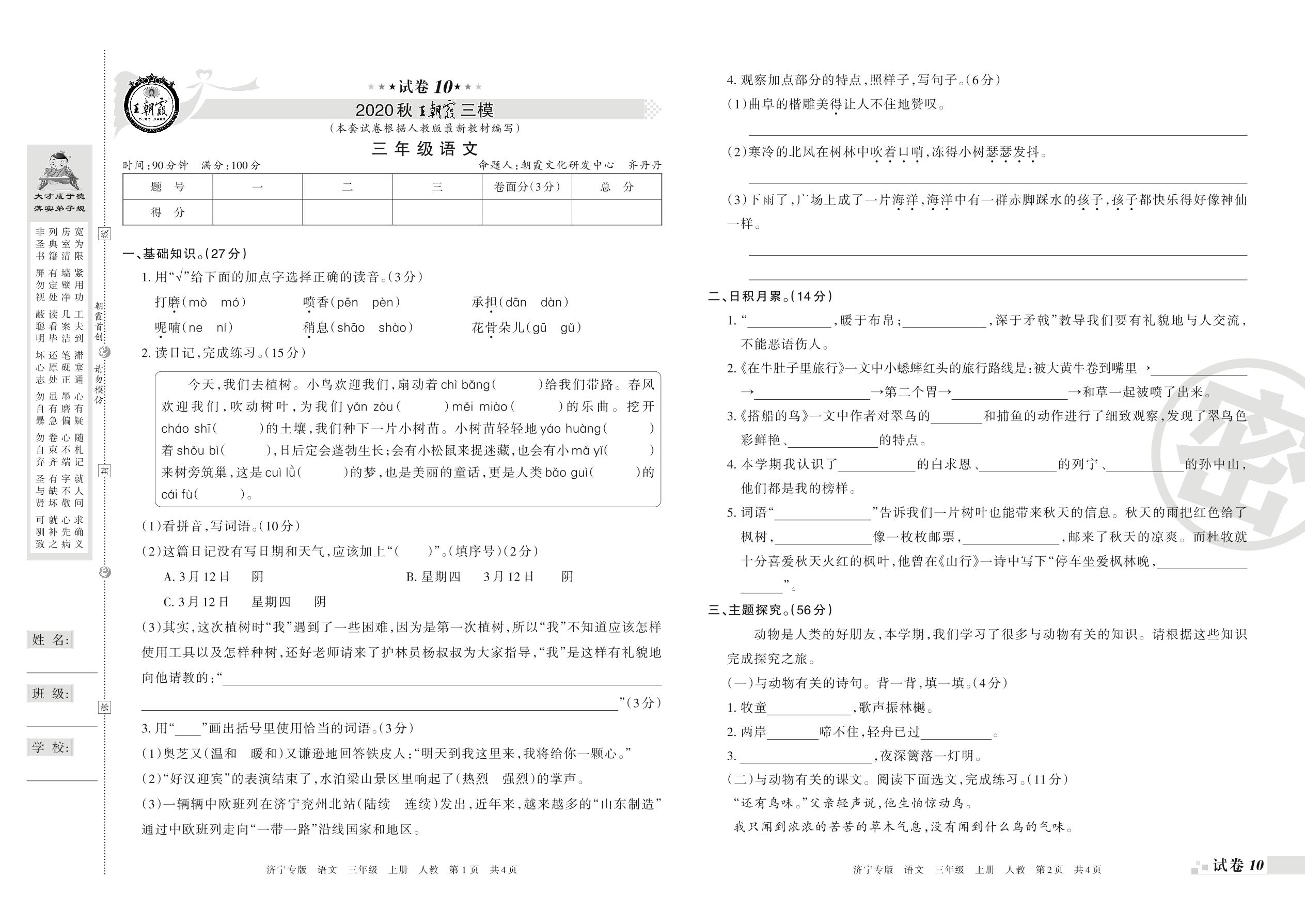 王朝霞期末模拟卷三年级上册语文(人教版)_R21080185233【10】