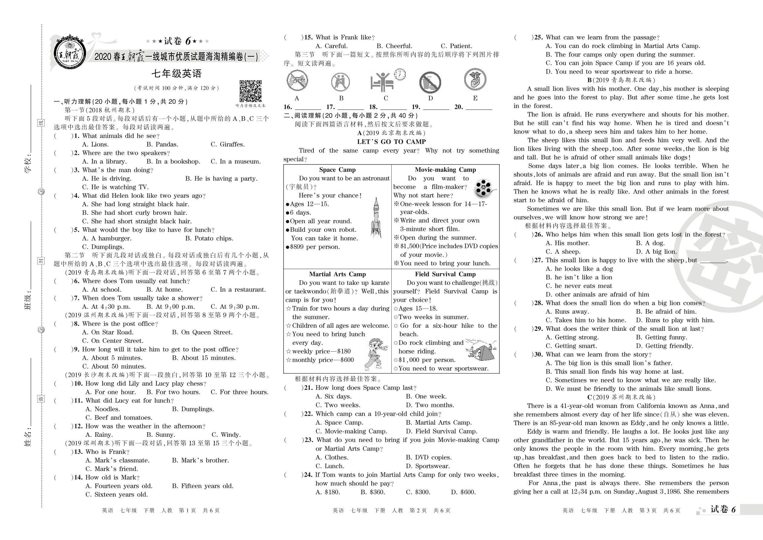 一线城市优质试题海淘精编卷(一)七年级下册英语(人教版)【6】