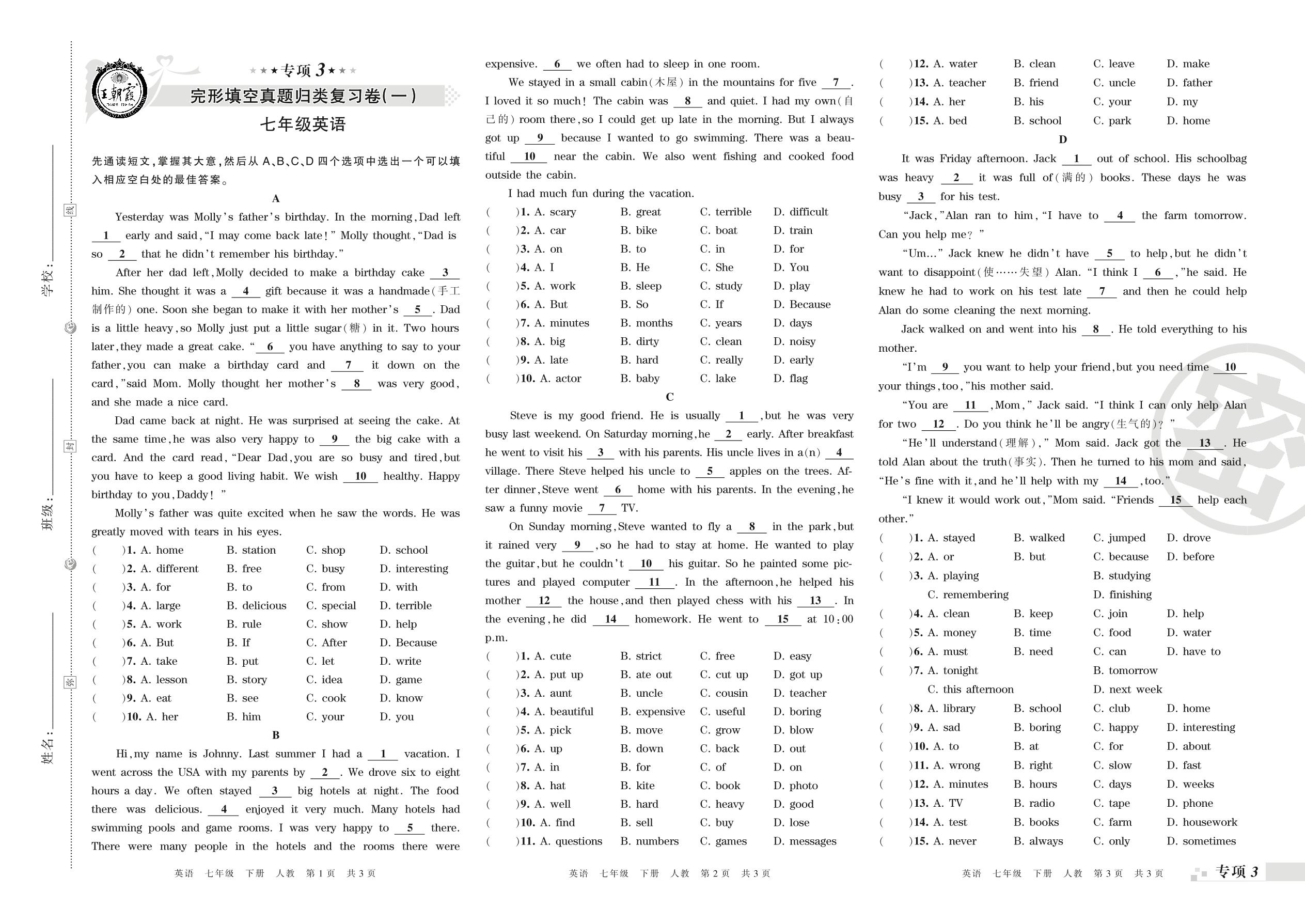 王朝霞期末专项卷——完形填空(一)(二)真题归类复习卷七年级下册英语(人教版)_R210807192713【0】