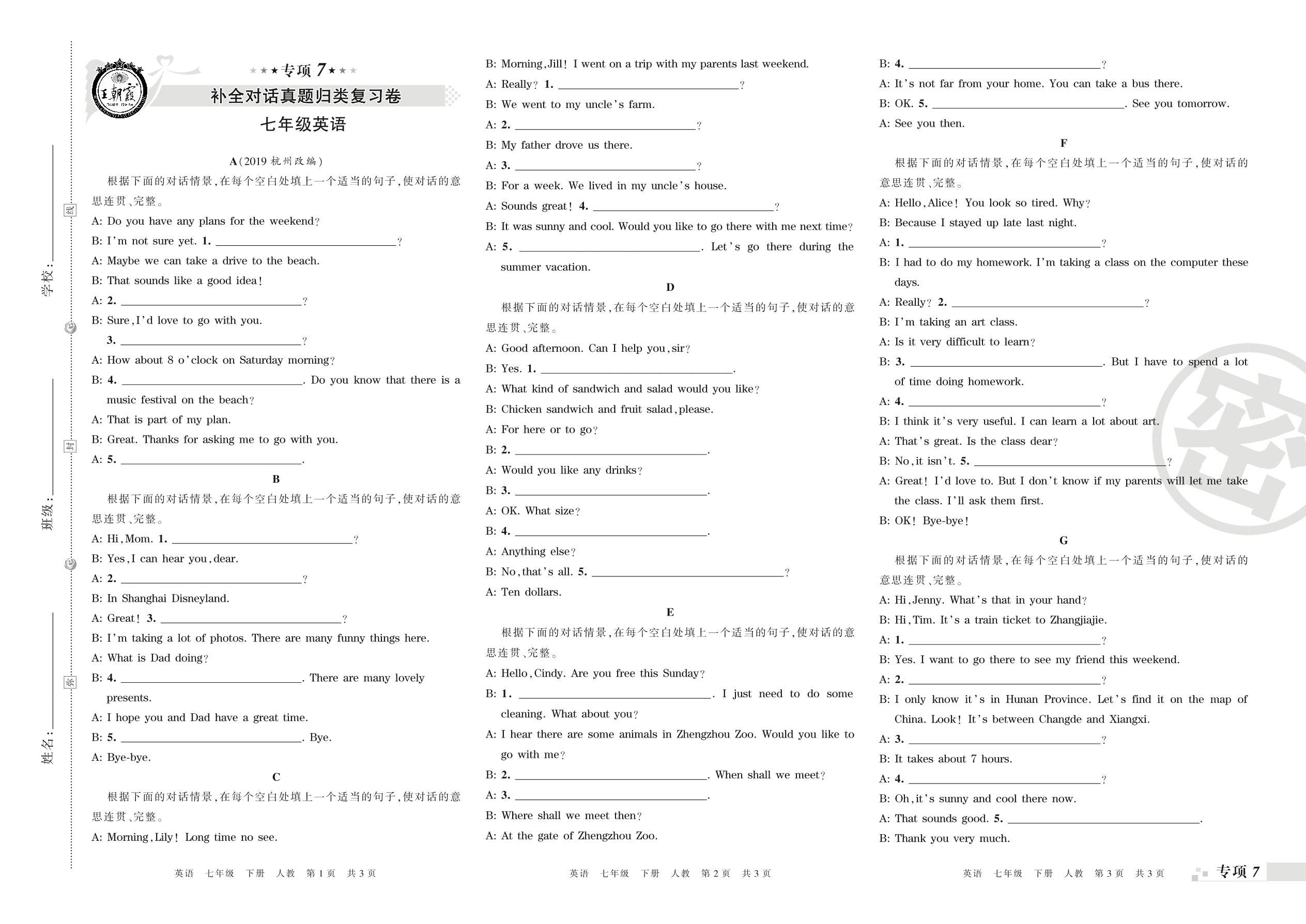 王朝霞期末专项卷——补全对话、书面表达真题归类复习卷七年级下册英语(人教版)_R210807192743【0】