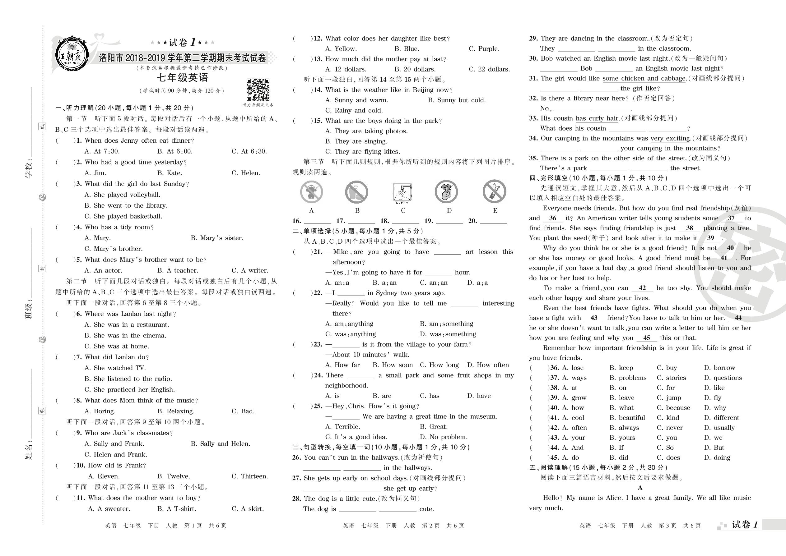 2018-2019学年第二学期洛阳市七年级英语试卷(人教版)【1】