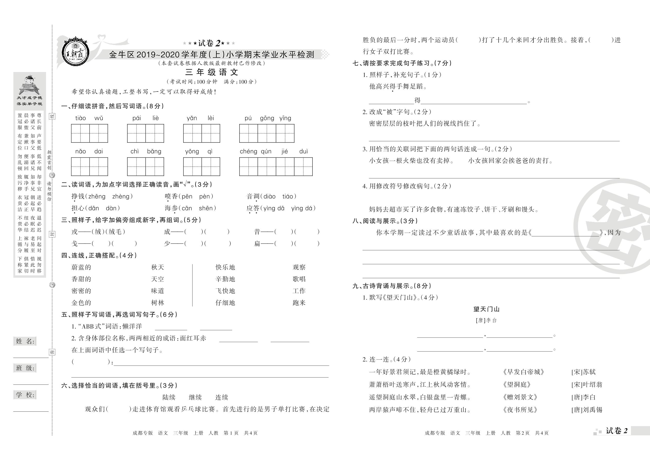 2019-2020学年第一学期成都市金牛区三年级语文试卷(人教版)【2】