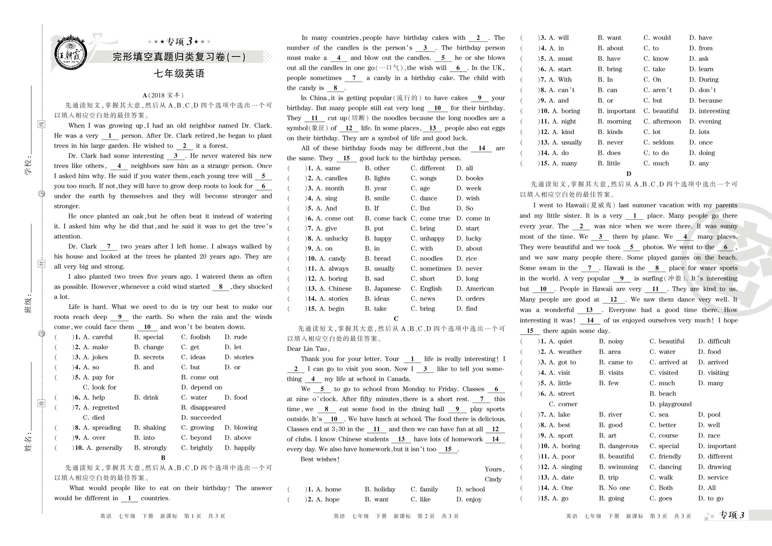 王朝霞期末专项卷——完形填空(一)(二)真题归类复习卷七年级下册英语(新课版)_R210807193154【0】