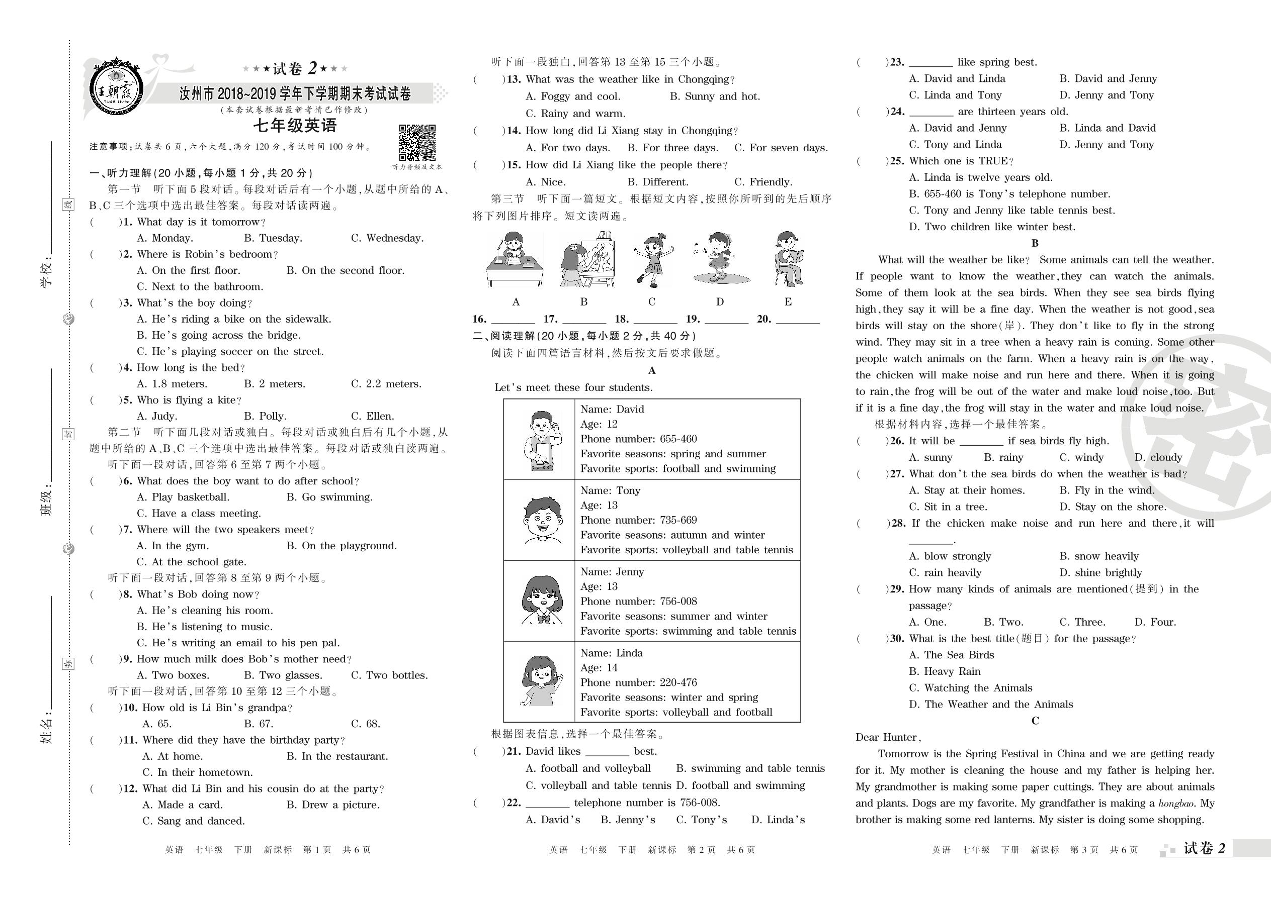 2018-2019学年第二学期汝州市七年级英语试卷(新课版)【2】