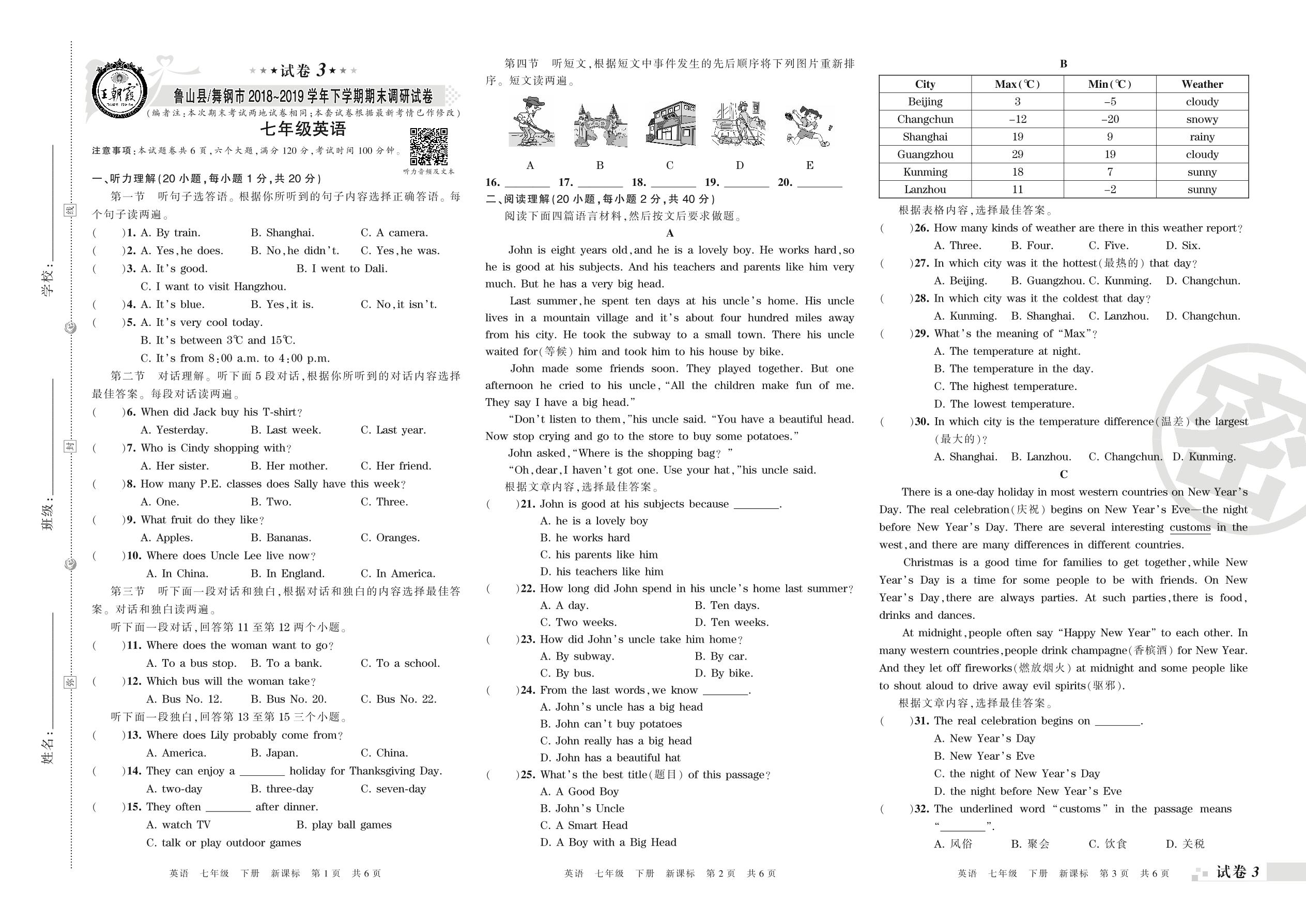 2018-2019学年第二学期鲁山县、舞钢市七年级英语试卷(新课版)【3】