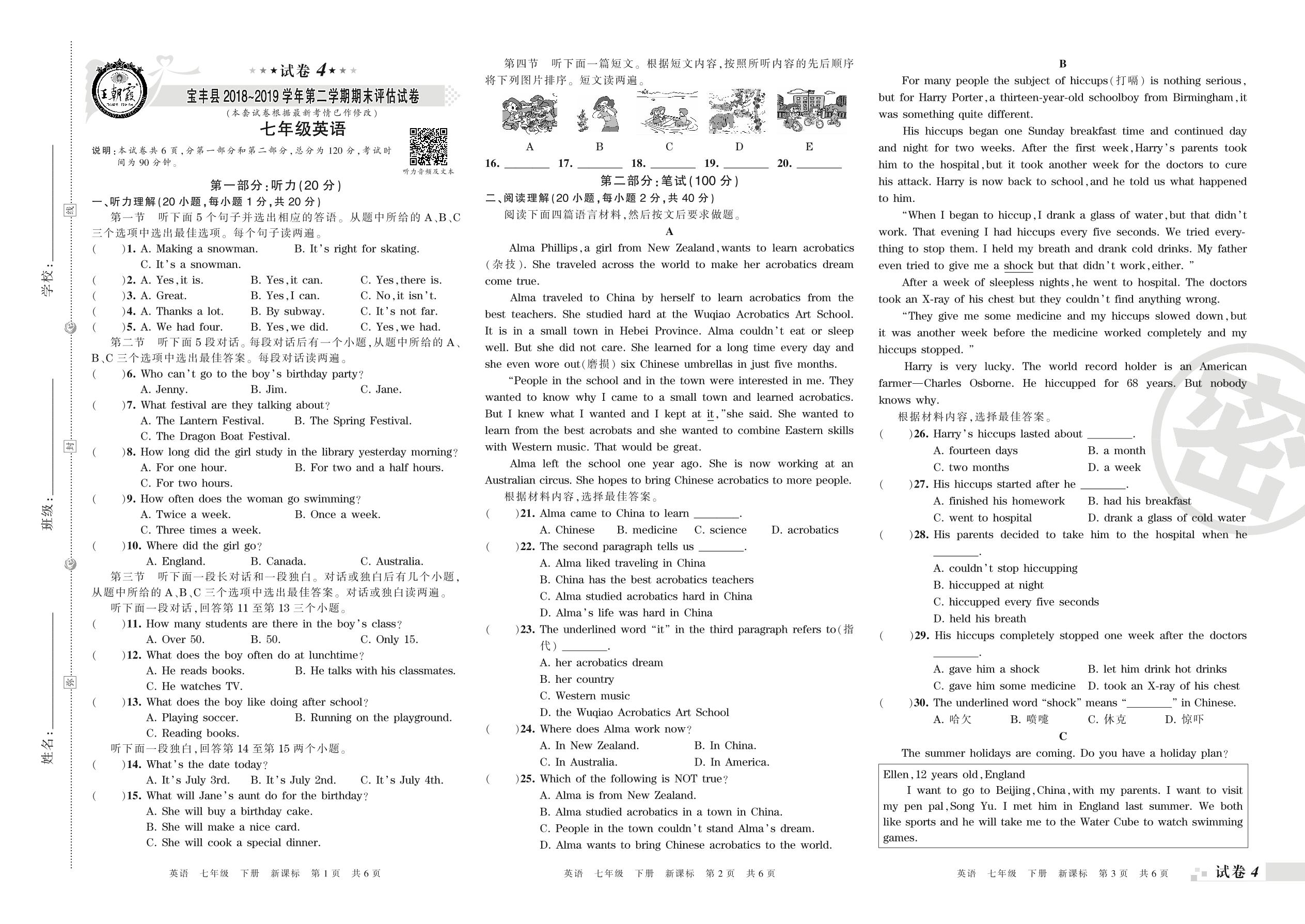 2018-2019学年第二学期平顶山市宝丰县七年级英语试卷(新课版)【4】